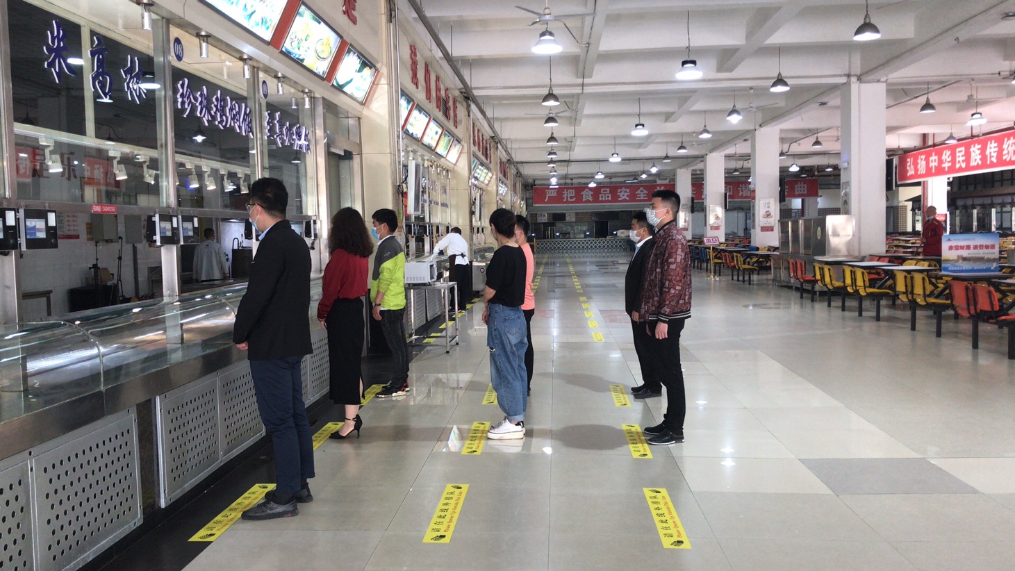 通過食堂溫馨提示、LED大屏幕等對就餐人員進行引導,間隔1米的排隊指示黃線,打飯時保持安全距離。