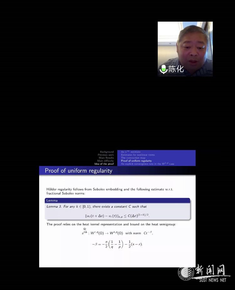 報告會上,陳化教授首先介紹了一類趨化模型的相關(guān)研究進展,然后針對Patlak-Keller-Segel模型的消失粘性問題,證明了初始值在特定空間內(nèi),原拋物-拋物系統(tǒng)存在不依賴于粘性系數(shù)的唯一解,且該解在適當意義下收斂到消失粘性問題的解。陳教授闡述了證明的思路、過程及關(guān)鍵步驟。