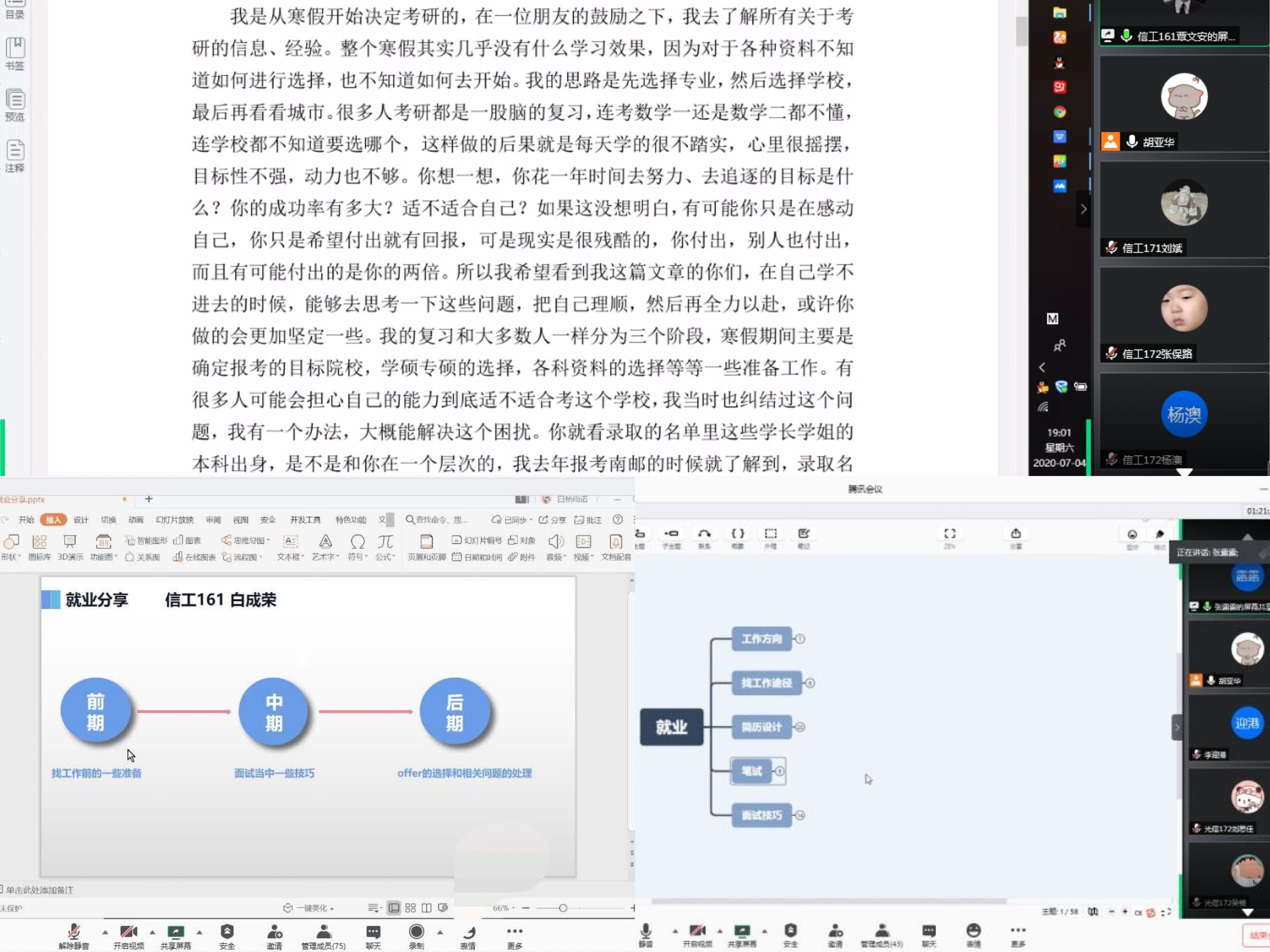 組織考研就業(yè)經(jīng)驗交流,薪火相傳。7月3日至4日,各黨支部聯(lián)合2017年級組在線上開展了“傳幫帶—考研就業(yè)經(jīng)驗交流會”主題黨日活動?;顒友埩藖碜援厴I(yè)年級的黨員代表、保研至我校的尚佳童同學(xué),經(jīng)歷考研失利后成功簽約京東方的黨員代表李文博同學(xué)等一批在在考研和就業(yè)方面比較突出的畢業(yè)生分享了相關(guān)經(jīng)驗。17級學(xué)生紛紛表示,此次特殊的黨日活動,給了自己很大的啟發(fā),讓他們對未來有了更清晰的規(guī)劃。