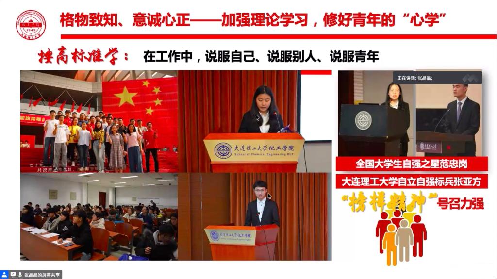 張晶晶結(jié)合共青團工作改革的思路與做法以及青年人如何開展理論學(xué)習(xí)兩項重點內(nèi)容,聯(lián)系大連理工大學(xué)的實際情況,向參會學(xué)員分享了“青馬工程”,“實驗室開放日”等品牌團學(xué)活動的開展情況與育人效果,用實際案例對青年團員寄予了“格物致知、意誠心正”、“日新而進、精進永固”的殷切期望。學(xué)員們認真聽講、積極互動,對授課內(nèi)容產(chǎn)生了強烈共鳴。