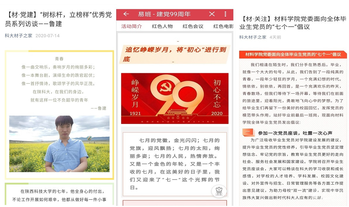云端獻(xiàn)禮,營造氛圍譜新篇。材料學(xué)院堅(jiān)持“疫情防控常態(tài)化”下的支部生活“云端化”,依托“科大才子之家”微信公眾號、易班等新媒體平臺(tái)相繼推出了“樹標(biāo)桿,立榜樣”優(yōu)秀黨員系列推文、“建黨99周年”易班快搭、紅色故事視頻以及針對畢業(yè)生黨員發(fā)起的“七個(gè)一”倡議等一系特色活動(dòng),在全院營造廣大黨員爭做先鋒,勇于擔(dān)當(dāng)作為的濃厚氛圍。