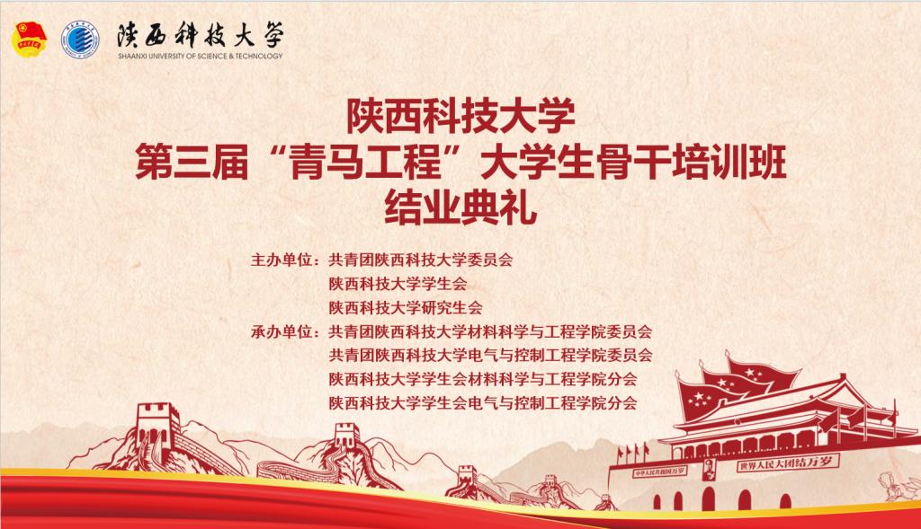 為深入學(xué)習(xí)貫徹習(xí)近平新時(shí)代中國特色社會(huì)主義思想和黨的十九大、全國學(xué)聯(lián)二十六大會(huì)議精神,秉承著“為同學(xué)服務(wù)”,提高學(xué)生骨干思想道德修養(yǎng),堅(jiān)定理想信念,為我校培養(yǎng)創(chuàng)新型、實(shí)干型人才的宗旨,我校舉辦了陜西科技大學(xué)第三屆“青馬工程”大學(xué)生骨干培訓(xùn)班。本屆大骨班由校團(tuán)委、校學(xué)生會(huì)和校研究生會(huì)主辦,材料科學(xué)與工程學(xué)院、電氣與控制工程學(xué)院團(tuán)委、學(xué)生分會(huì)承辦,歷時(shí)兩個(gè)月終于落下帷幕,于7月28日上午十時(shí)在騰訊會(huì)議舉行結(jié)業(yè)典禮。