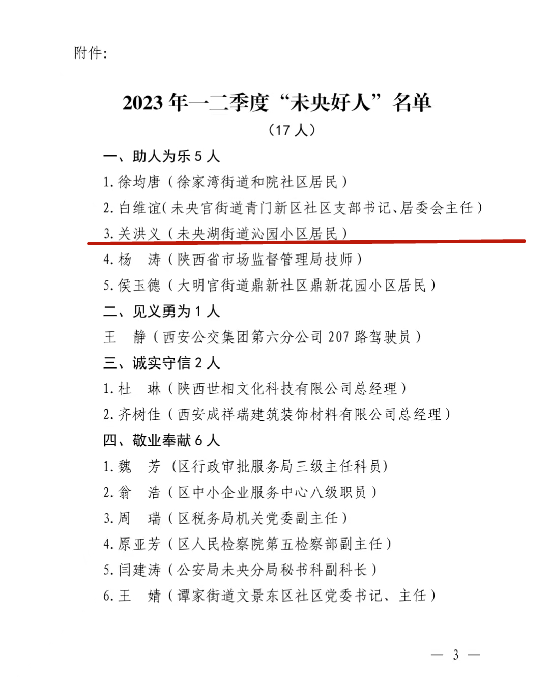 中共西安市未央?yún)^(qū)委文明辦日前下發(fā)〔2023〕16號文件《關(guān)于公布2023年一二季度“未央好人”名單的通知》,陜西科技大學(xué)沁園社區(qū)居民關(guān)洪義獲評“未央好人”榮譽(yù)稱號。