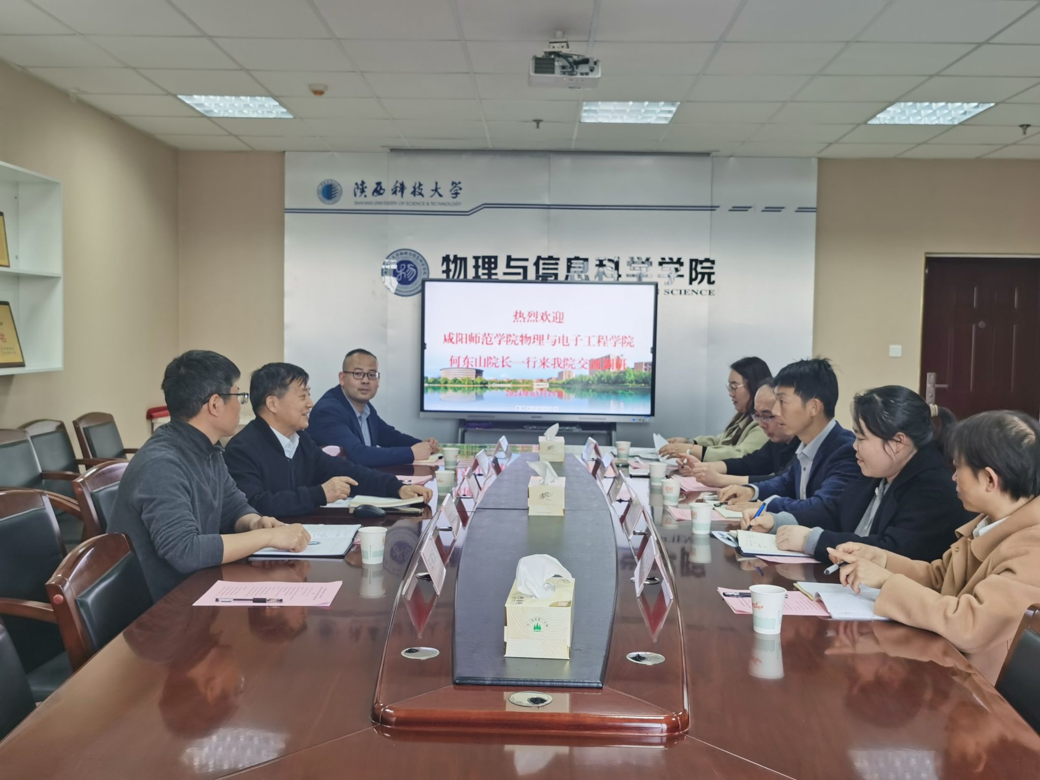 座談會(huì)上,何東山介紹了咸陽(yáng)師范學(xué)院物理學(xué)專業(yè)的發(fā)展歷史和此次調(diào)研交流目的。他表示,希望通過(guò)交流訪問(wèn),在專業(yè)建設(shè)、本科教學(xué)及研究生培養(yǎng)等方面加強(qiáng)與陜西科技大學(xué)物理與信息科學(xué)學(xué)院合作。劉建科代表學(xué)院對(duì)何東山一行來(lái)訪表示熱烈歡迎,并介紹了我?!叭齽?chuàng)兩遷”辦學(xué)歷史及近年來(lái)學(xué)校在師資隊(duì)伍建設(shè)、學(xué)科建設(shè)、科學(xué)研究、教育教學(xué)、人才培養(yǎng)等方面發(fā)展情況以及物理學(xué)院的基本情況。與會(huì)人員圍繞課程教學(xué)、學(xué)生科技競(jìng)賽、考研就業(yè)、科研合作、實(shí)驗(yàn)室建設(shè)等工作進(jìn)行了深入探討和互動(dòng)交流。