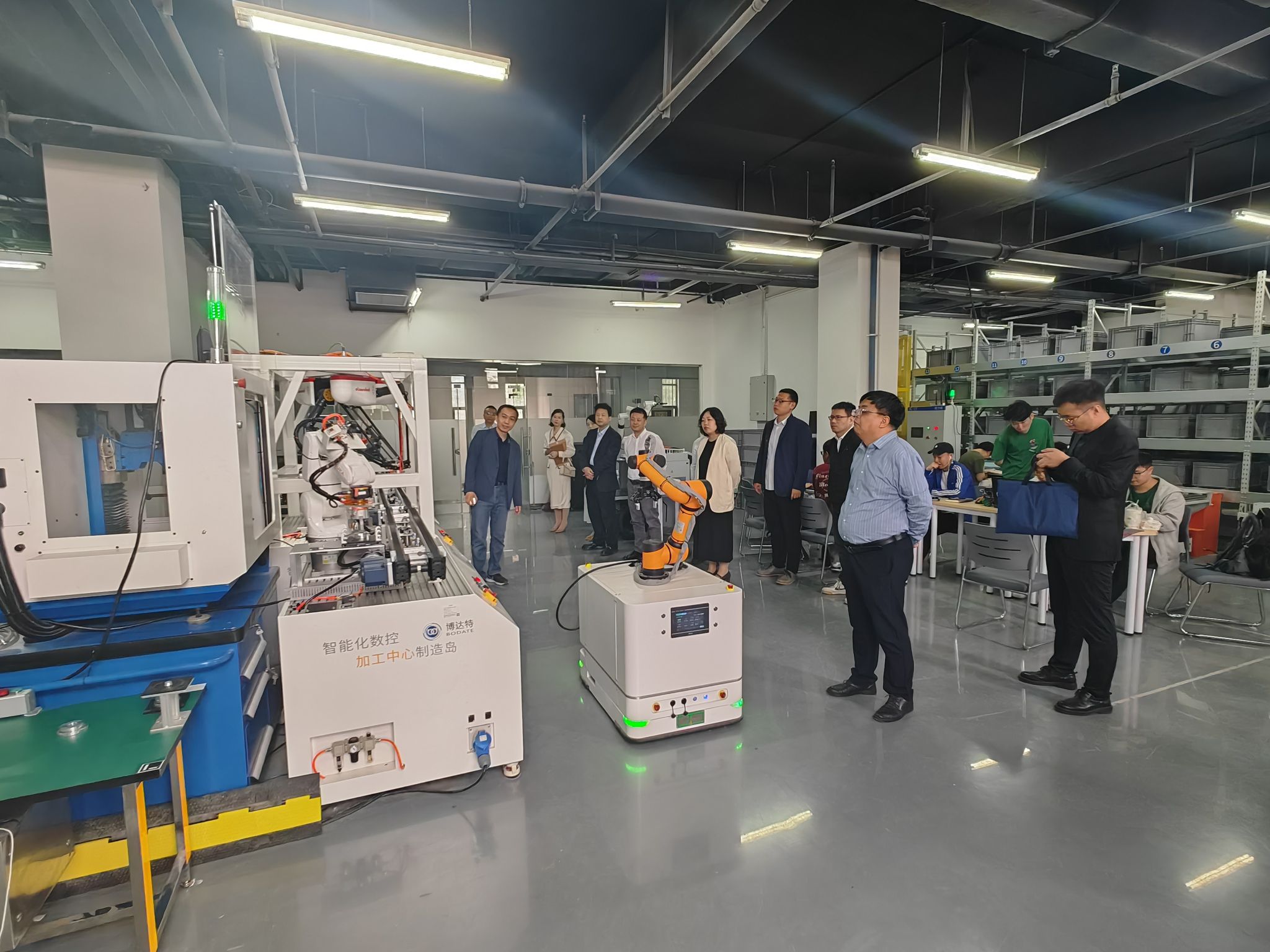 在中瑞GF智能制造創(chuàng)新研究院,考察了智能制造生產(chǎn)線、正在調(diào)試中的五軸加工中心、導(dǎo)軌機(jī)器人,以及智能倉儲穿梭車系統(tǒng)。在智能制造柔性生產(chǎn)線中,具有語音功能的AGV小車自動對各加工工位進(jìn)行導(dǎo)覽和講解,MES系統(tǒng)大屏幕能夠自動顯示產(chǎn)線運(yùn)行狀態(tài)和生產(chǎn)信息,產(chǎn)線中的機(jī)器人、傳送帶、加工單元有條不紊的工作,展示了現(xiàn)代制造生產(chǎn)線的運(yùn)行狀況。在加工制造區(qū)域,MES系統(tǒng)顯示屏幕顯示兩臺加工中心的加工信息,地軌機(jī)器人能夠?qū)⒃牧戏湃胍慌_加工中心加工,并將粗加工的產(chǎn)品取出,放入另一臺加工中心進(jìn)行精密加工,加工完畢后,將產(chǎn)品取出放入倉位。張琳對機(jī)電學(xué)院在智能制造、柔性生產(chǎn)線方面的研發(fā)條件、實(shí)驗(yàn)環(huán)境表示贊賞,希望學(xué)院能夠利用好這些科研條件,與浐灞國際港達(dá)成深度合作。趙江民就柔性生產(chǎn)線、穿梭車技術(shù)與參加培訓(xùn)的教師、研究生進(jìn)行了交流。