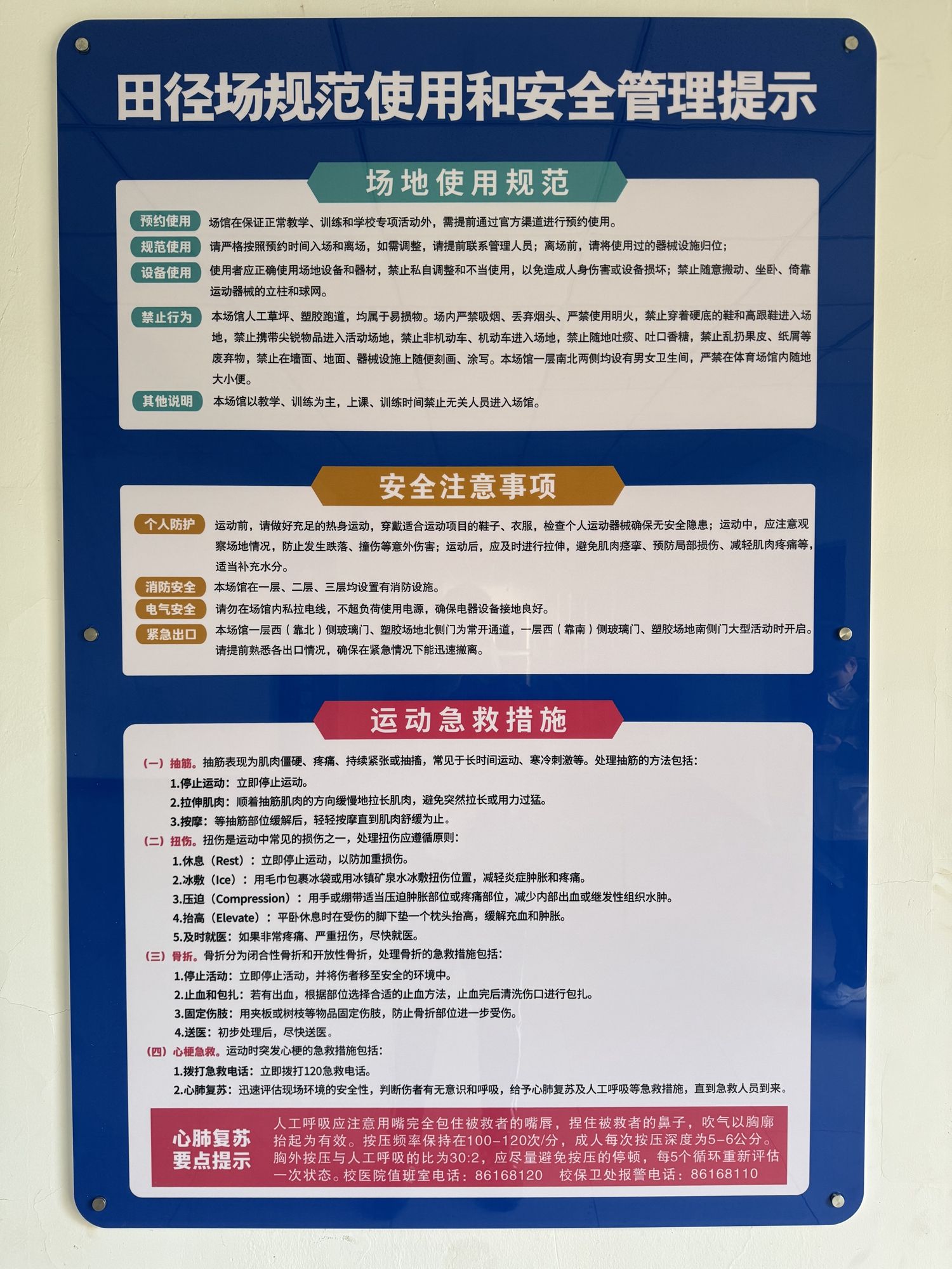 為進(jìn)一步提高師生運(yùn)動(dòng)的安全防護(hù),體育部組織對(duì)北區(qū)體育館燈光進(jìn)行升級(jí)更換,在所有體育場(chǎng)館內(nèi)顯著位置安裝安全提示三色板,通過強(qiáng)調(diào)場(chǎng)館規(guī)范使用說明、場(chǎng)館使用安全注意事項(xiàng)、運(yùn)動(dòng)損傷急救等內(nèi)容,提醒使用者注意安全事項(xiàng),增強(qiáng)自我保護(hù)意識(shí)。堅(jiān)持常態(tài)化的場(chǎng)地安全檢查制度,專人記錄檢查結(jié)果,及時(shí)建立工作臺(tái)賬,跟蹤場(chǎng)地設(shè)施問題整改,從問題發(fā)現(xiàn)到問題解決實(shí)現(xiàn)閉環(huán)管理,確保隱患無處遁形。