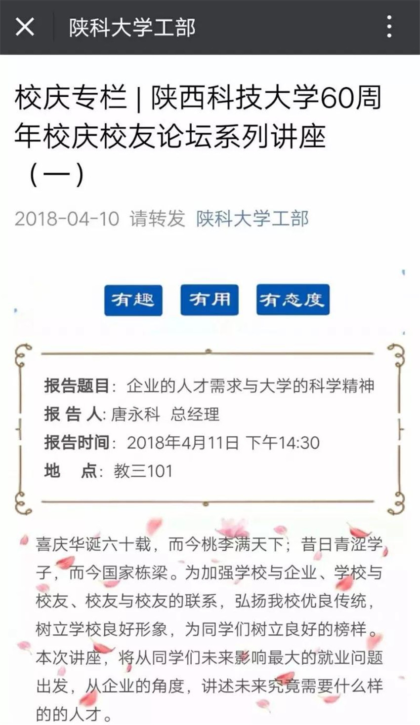 其中學(xué)工部官微定期推送校慶主題系列推文,以“我與科大的故事”、“校友論壇”、“名師工作坊”等欄目展現(xiàn)科大的優(yōu)美景色、追溯科大的發(fā)展歷程、挖掘科大的感人故事,進一步推進和內(nèi)化了“三創(chuàng)兩遷”的大學(xué)精神和“至誠至博”的校訓(xùn)文化,為在校學(xué)生營造濃厚的校慶氛圍。