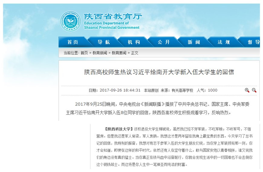 9月26日,陜西省教育廳門戶網(wǎng)站在頭版“教育要聞”的《陜西高校師生熱議習(xí)近平給南開大學(xué)新入伍大學(xué)生的回信》報(bào)道中,報(bào)道了陜西科技大學(xué)青年學(xué)子觀看學(xué)習(xí)中央電視臺(tái)《新聞聯(lián)播》播報(bào)的中共中央總書記、國(guó)家主席、中央軍委主席習(xí)近平給南開大學(xué)新入伍8位同學(xué)的回信,反響熱烈。