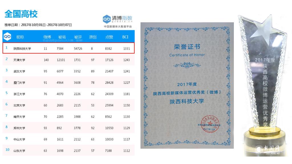 陜西科技大學黨委宣傳部于2014年先后開通官方微博、官方微信,并于2017年成立觀微工作室。截止2017年12月,我校官方微博粉絲已接近2萬人,累計發(fā)送微博5700余條。我校微博立足校園服務(wù)社會,利用自身網(wǎng)絡(luò)影響力向社會各界傳遞正能量,在信息傳播、引導涉校輿論、輿情應(yīng)對、網(wǎng)絡(luò)文化建設(shè)等方面發(fā)揮重要作用。在全國800多所高校微博影響力排行榜“周榜”中多次位列前茅,最高影響力排名全國第一名。