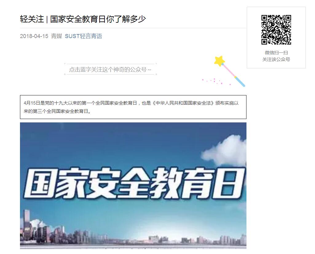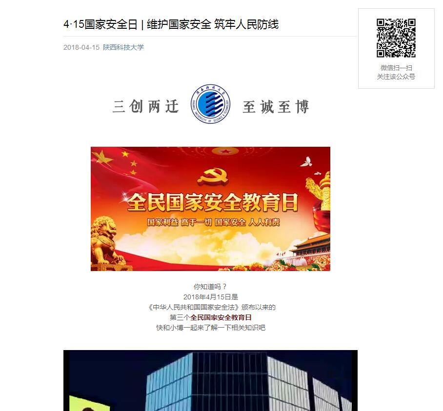宣傳部在學(xué)校主頁(yè)制作發(fā)布了“國(guó)家安全教育日”主題大圖,學(xué)校官方微信平臺(tái)、微博、QQ公眾號(hào)等新媒體相繼推送了“維護(hù)國(guó)家安全 筑牢人民防線”主題宣傳,通過(guò)微視頻、圖解等形式,宣傳普及國(guó)家安全知識(shí)及相關(guān)法律法規(guī)。