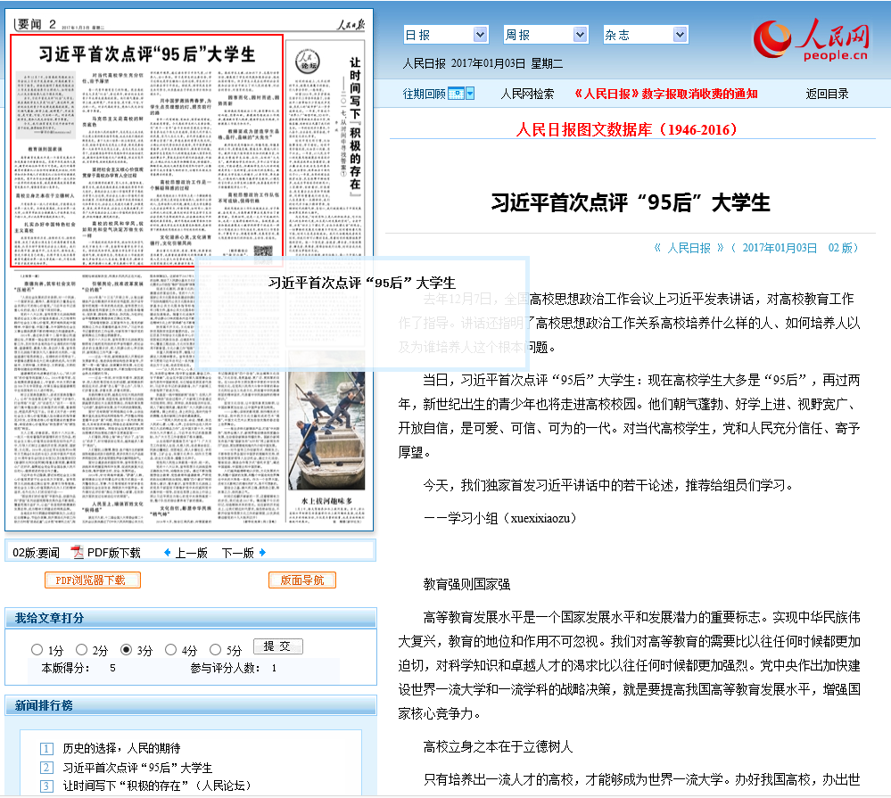 2017年01月03日《人民日?qǐng)?bào)》第二版“要聞”欄目登載了“學(xué)習(xí)小組”微信公眾號(hào)發(fā)布的《習(xí)近平首次點(diǎn)評(píng)“95后”大學(xué)生》一文,全文轉(zhuǎn)載如下: