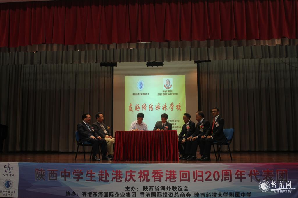 7月4日上午,我校師生代表團一行33人來到香港品牌學(xué)校香港博愛醫(yī)院歷屆總理聯(lián)誼會梁省德中學(xué)。該校舉行了隆重的歡迎及締結(jié)姊妹學(xué)校簽約儀式,儀式首先由博愛醫(yī)院歷屆總理聯(lián)誼會梁省德中學(xué)校長楊文德先生致歡迎詞,對代表團一行的到來表示了歡迎。陜西科技大學(xué)附屬中學(xué)黨總支書記王幃致辭,表達(dá)了對梁省德中學(xué)、香港各界熱情接待和精心安排的由衷感謝,并介紹了陜科大附中近幾年取得的教育教學(xué)成果。全國政協(xié)委員、陜西省政協(xié)常委、陜西省海外聯(lián)誼會名譽會長、香港國際投資總商會會長許智銘先生致辭,表達(dá)了對本次交流訪問活動的期待,希望通過此次活動,為兩校學(xué)生搭建橋梁,互相學(xué)習(xí),加深了解,增進香港學(xué)生對內(nèi)地文化的了解,共同推動兩地兩校的文化交流,為培養(yǎng)有胸懷、有作為的中國青年而努力,并表達(dá)了對陜港兩地友誼的祝福,對香港回歸20周年的慶賀。