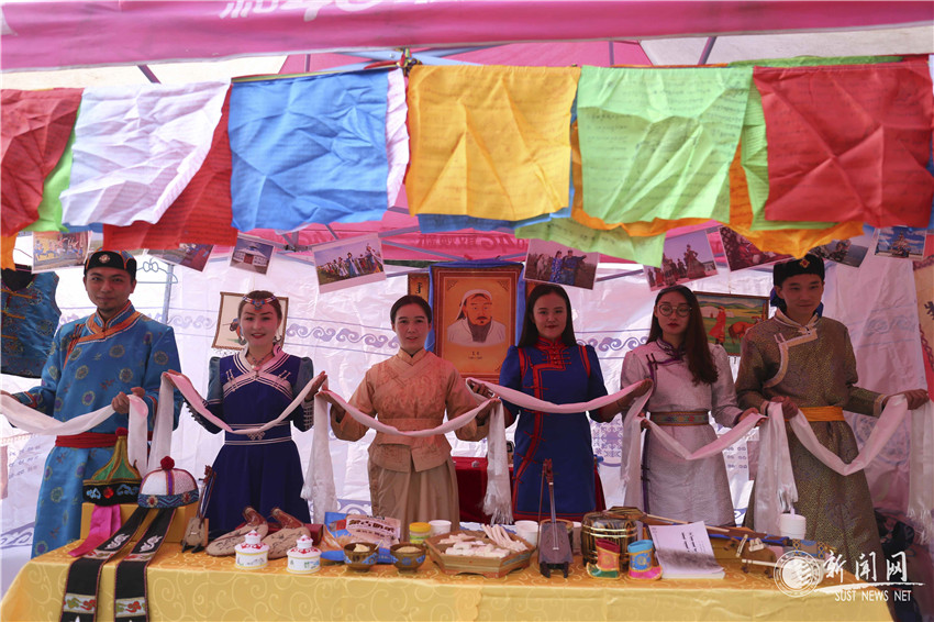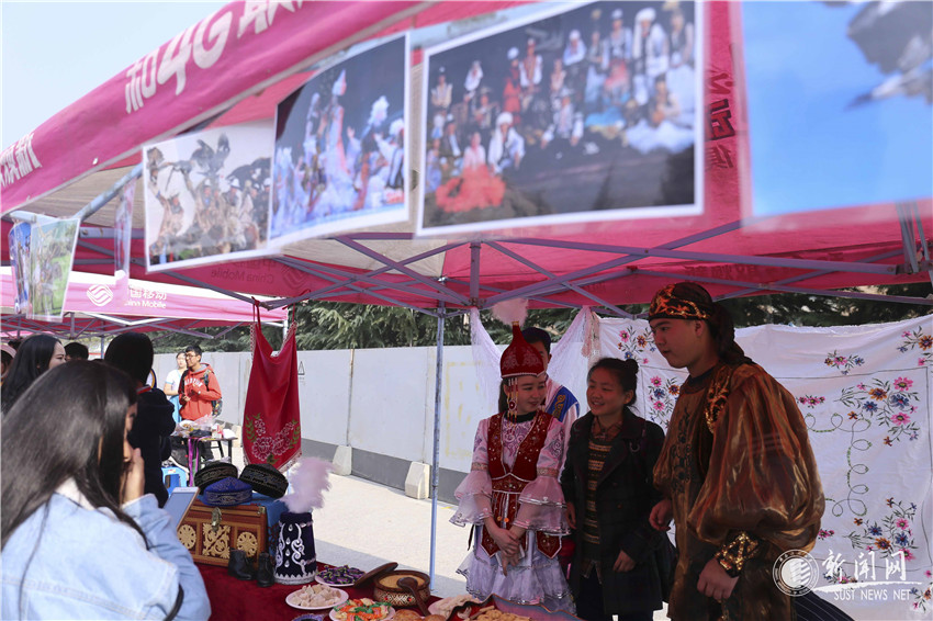 還不到活動(dòng)正式開(kāi)始時(shí)間,沁園廣場(chǎng)上已經(jīng)是一片如火如荼的景象了:七個(gè)不同民族各據(jù)一頂帳篷,每個(gè)帳篷里都擺滿了各色民族特色食物、服裝首飾和道具模型。身著民族服裝的姑娘小伙熱情洋溢,一見(jiàn)有人到帳篷下便馬上笑容滿面地介紹自己的民族。