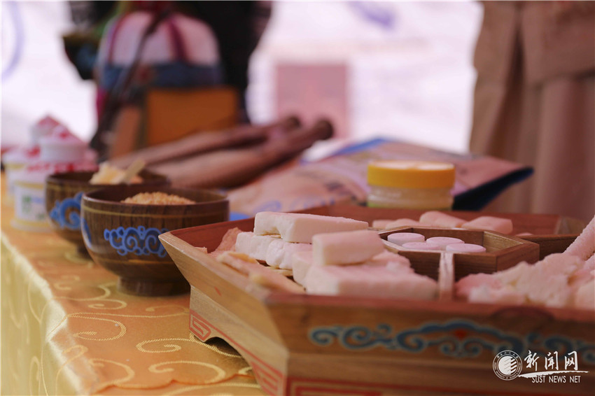 蒙古族則將蒙古民用以招待客人的奶干、奶酪、奶豆腐、馬奶酒等奶制品擺上盤(pán)子里,還有哈達(dá)、馬頭琴、弓箭模型等物品,讓我們感受到了來(lái)自草原的熱情。