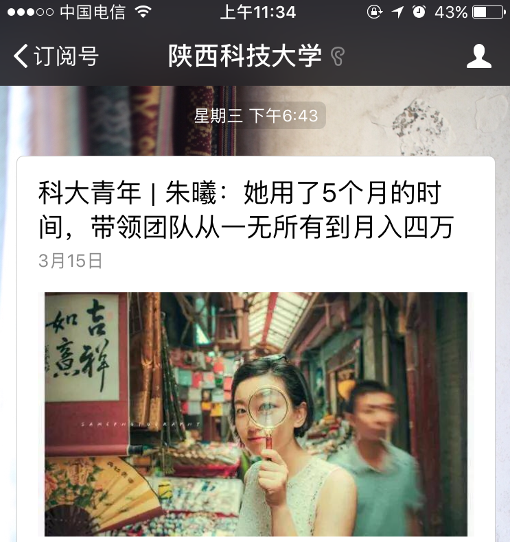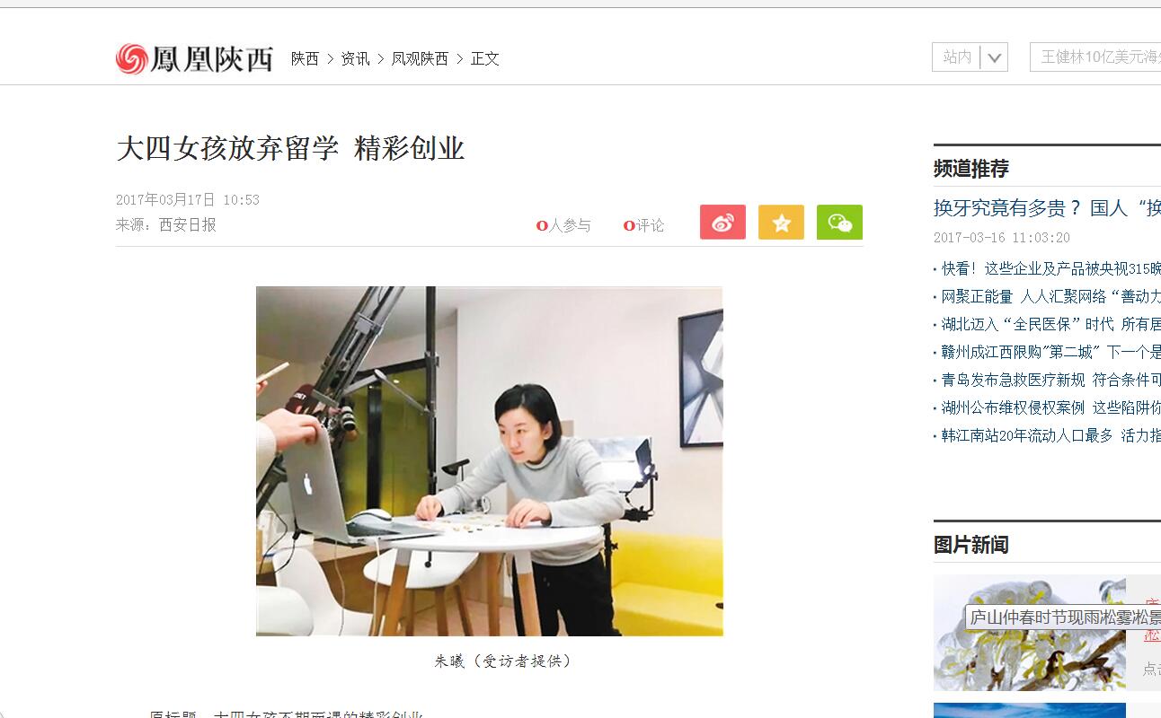 3月15日,一篇《科大青年 | 朱曦:她用了5個月的時間,帶領(lǐng)團隊從一無所有到月入四萬》的深度報道在我校官微發(fā)出后,迅速引起了眾多媒體的關(guān)注。朱曦,這位我校大四女孩的精彩創(chuàng)業(yè)故事先后被西安日報、網(wǎng)易、鳳凰網(wǎng)等報道或轉(zhuǎn)載,陜西省教育廳微博也推送了一條關(guān)于朱曦創(chuàng)業(yè)團隊的“從0開始,向1邁進”的微博。