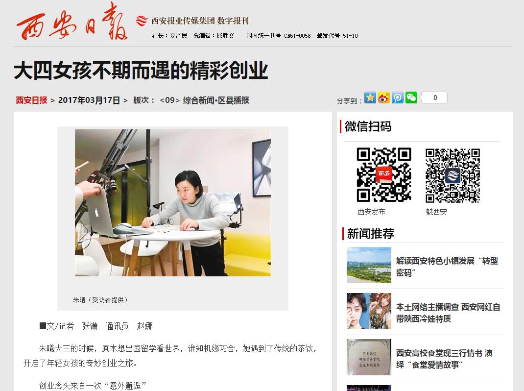 朱曦的創(chuàng)業(yè)故事引發(fā)了外媒的高度關(guān)注。省教育廳微博推送了“從0開始,向1邁進”的微博,簡要介紹朱曦的創(chuàng)業(yè)經(jīng)歷。西安日報迅速派出記者采寫并刊發(fā)了題為《大四女孩不期而遇的精彩創(chuàng)業(yè)》的報道,鳳凰網(wǎng)、網(wǎng)易、搜狐等多家主流媒體紛紛進行了轉(zhuǎn)載報道。