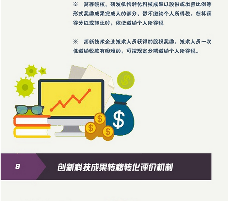 八、加大科技成果轉(zhuǎn)移轉(zhuǎn)化財(cái)稅支持力度。高等院校、研發(fā)機(jī)構(gòu)轉(zhuǎn)化科技成果以股份或出資比例等形式獎(jiǎng)勵(lì)成果完成人的部分,暫不繳納個(gè)人所得稅,在其獲得分紅或轉(zhuǎn)讓時(shí),依法繳納個(gè)人所得稅;高新技術(shù)企業(yè)技術(shù)人員獲得的股權(quán)獎(jiǎng)勵(lì),技術(shù)人員一次性繳納稅款有困難的,可按規(guī)定分期繳納個(gè)人所得稅。