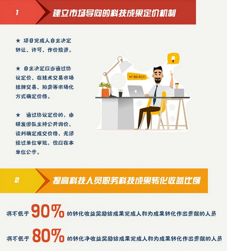 一、建立市場(chǎng)導(dǎo)向的科技成果定價(jià)機(jī)制。利用財(cái)政性資金資助形成的科技成果,除涉及國(guó)防、國(guó)家安全、國(guó)家利益和重大社會(huì)公共利益的,可以由高等院校、研發(fā)機(jī)構(gòu)的項(xiàng)目完成人自主決定轉(zhuǎn)讓、許可、作價(jià)投資。自主決定轉(zhuǎn)讓、許可、作價(jià)投資應(yīng)當(dāng)通過(guò)協(xié)議定價(jià)、在技術(shù)交易市場(chǎng)掛牌交易、拍賣等市場(chǎng)化方式確定價(jià)格。通過(guò)協(xié)議定價(jià)的,由研發(fā)團(tuán)隊(duì)主持公開詢價(jià),談判確定成交價(jià)格,無(wú)須經(jīng)過(guò)單位審批,但應(yīng)在本單位公示。