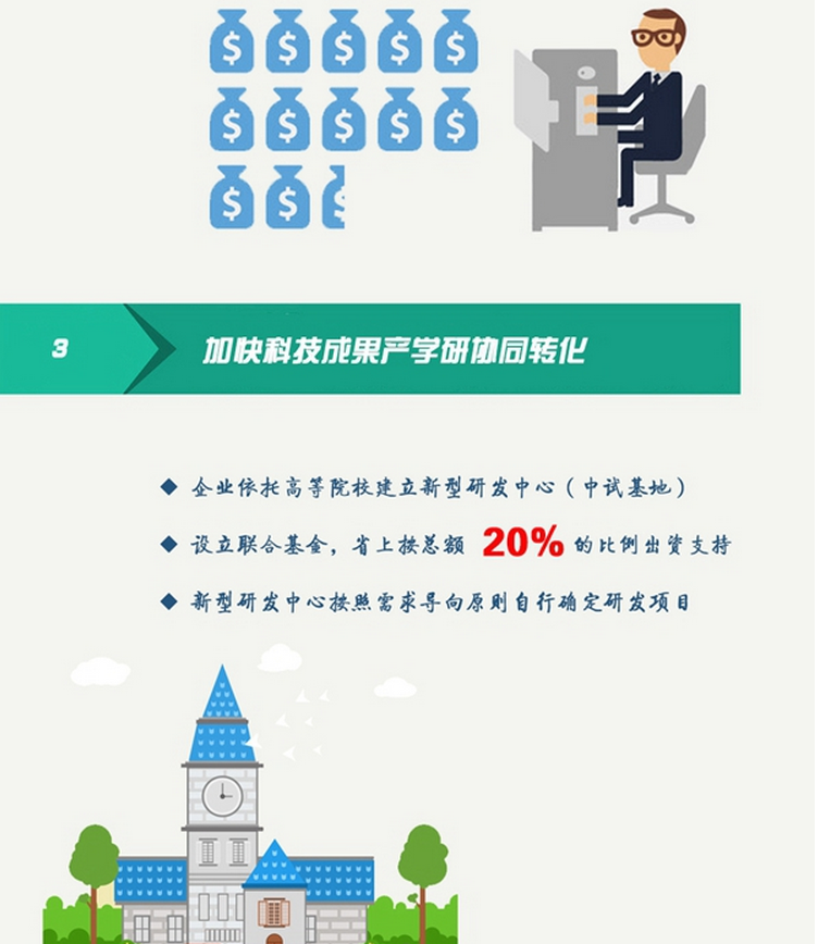 三、加快科技成果產(chǎn)學(xué)研協(xié)同轉(zhuǎn)化。支持企業(yè)依托高等院校建立產(chǎn)學(xué)研深度融合的新型研發(fā)中心(中試基地),設(shè)立聯(lián)合基金,省上按總額20%的比例出資支持,新型研發(fā)中心(中試基地)按照需求導(dǎo)向原則自行確定研發(fā)項(xiàng)目。對(duì)獲得國(guó)家科技獎(jiǎng)勵(lì)的重大成果進(jìn)行轉(zhuǎn)化的,給予省級(jí)科技計(jì)劃立項(xiàng)支持 。