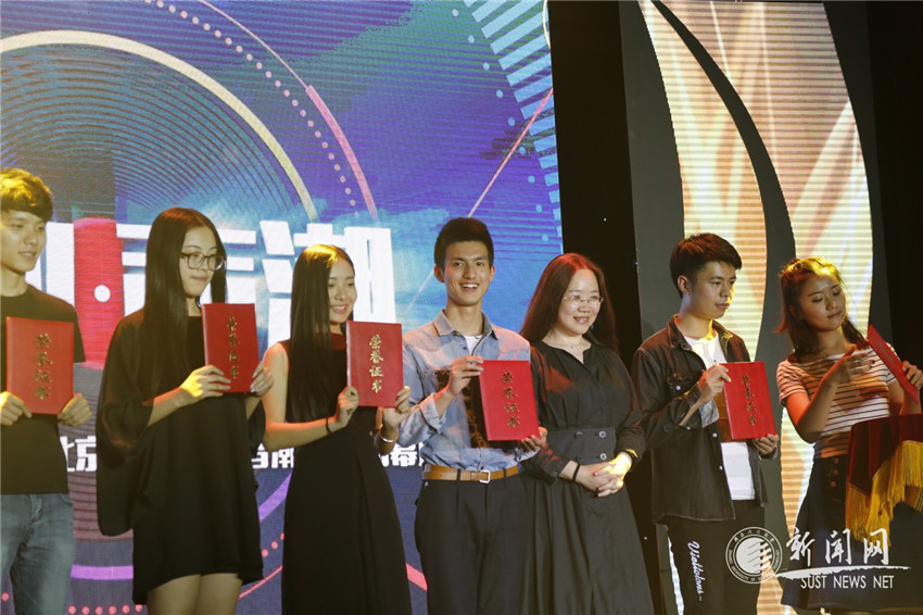 “科大之聲”廣播臺(tái)潘婷婷(左三)、李清(左四)在頒獎(jiǎng)典禮上領(lǐng)獎(jiǎng)