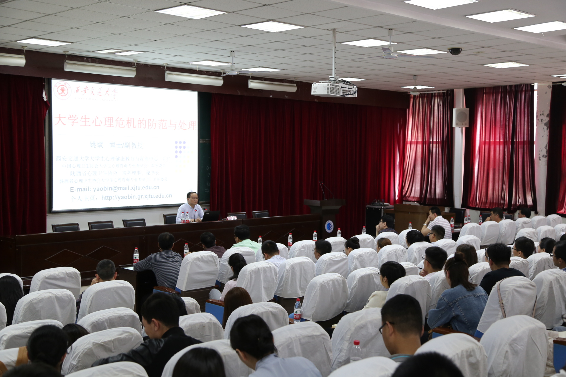 4月19日下午,中國心理衛(wèi)生協(xié)會理事、西安交通大學(xué)大學(xué)生心理健康教育與咨詢中心主任姚斌博士應(yīng)邀在3號教學(xué)樓101報告廳作題為“大學(xué)生心理危機的預(yù)防與處理”的專題報告。學(xué)工系統(tǒng)全體工作人員聆聽了報告。報告由學(xué)工部副部長李萌主持。