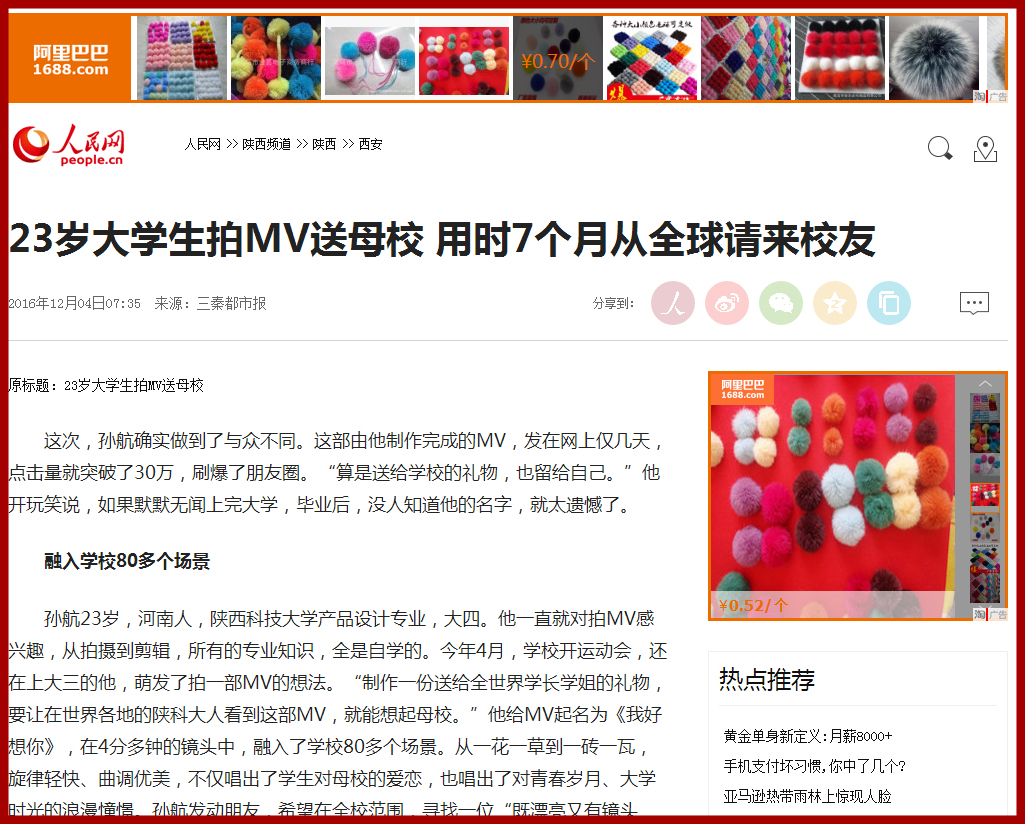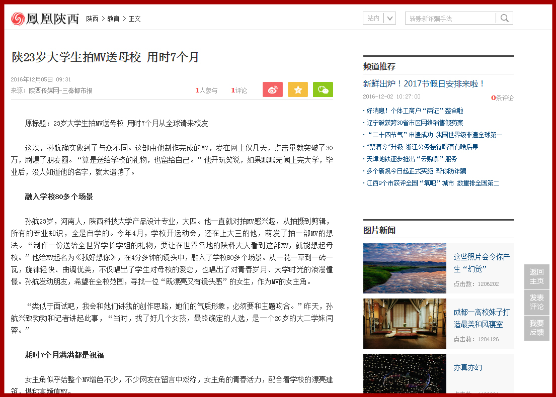 《好想你》發(fā)布以來,人民網(wǎng)、新浪網(wǎng)、鳳凰網(wǎng)、騰訊網(wǎng)、大秦網(wǎng)、三秦都市報等數(shù)十家網(wǎng)站、媒體都對孫航同學為母校拍攝MV 的事跡進行報道,陜西電視臺也在12月1日的都市快報欄目進行了報道,轉載如下: