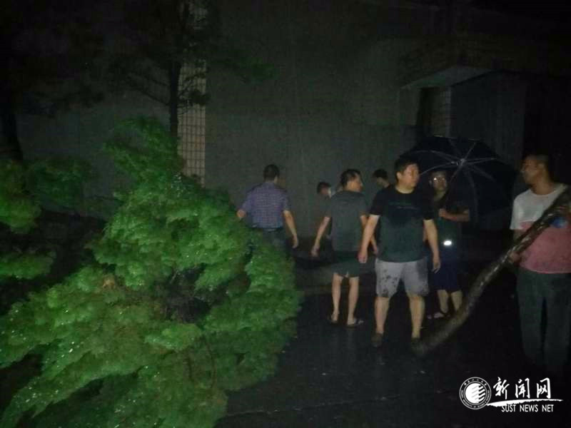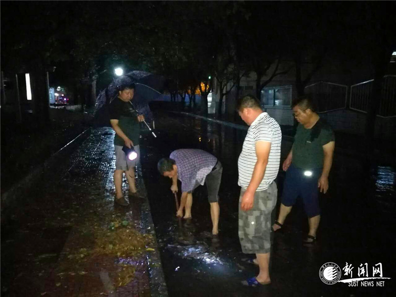 由于暴雨來勢洶猛,過多樹葉等雜物被沖擊到雨水井口,導致多處雨水井排水不暢,校區(qū)內多處路段大面積積水,嚴重影響到校區(qū)人行的安全,同時樹木倒伏、樹干被大風刮斷等問題也嚴重影響了校園安全秩序。咸陽校區(qū)管委會第一時間啟動應急預案,管委會班子各位成員迅速來到現(xiàn)場了解積水狀況,組織人力排查道路積水嚴重區(qū)域,疏通雨、污水井。10多名干部職工連續(xù)奮戰(zhàn),積極排除險情,冒雨打開積水區(qū)雨、污水井蓋排水。同時將倒伏的樹木移到路邊,確保道路暢通。晚11時許,經(jīng)過近4個小時冒雨奮戰(zhàn),咸陽校區(qū)所有重點路段積水全部排盡,道路恢復暢通。