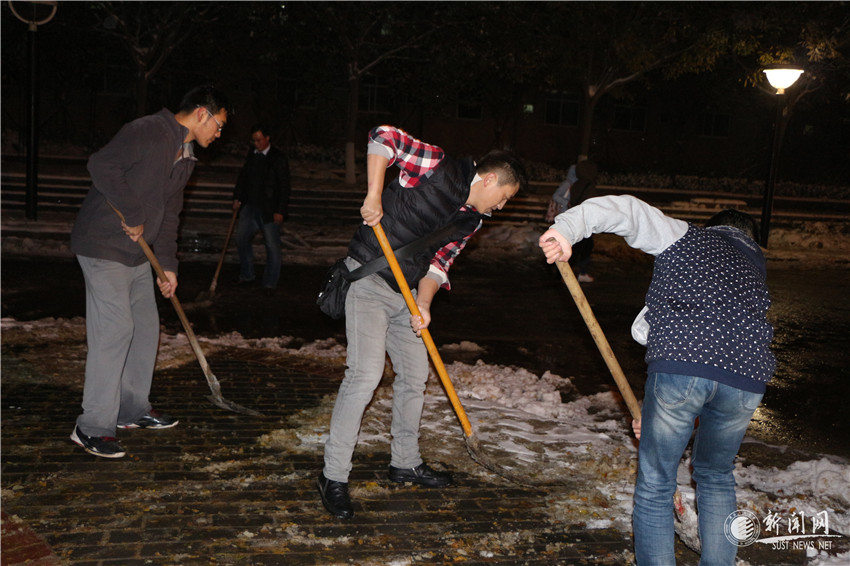 當(dāng)晚,號召一經(jīng)發(fā)出,學(xué)校陽光助學(xué)中心、國旗護衛(wèi)隊、公寓自管會、易班工作站紛紛響應(yīng),建立起愛心隊伍組織鏟雪行動,黨委副書記溫鋒也親臨現(xiàn)場參與鏟雪。冬日的雪夜寒風(fēng)刺骨,志愿者們的手都凍得通紅,但他們依然精神抖擻,不言辛苦,冒著嚴(yán)寒繼續(xù)鏟雪。他們的奉獻之心感染了路過的學(xué)生們,紛紛加入到了掃雪除冰的隊伍中。從黨員到群眾,從教師到學(xué)生,所有人的愛心匯聚成熾熱跳躍的火焰,點亮,溫暖了科大寒冷的夜。師生們齊心協(xié)力讓這個雪天不再“濕滑”,切實保障了師生們的出行,保障了學(xué)校各項教學(xué)科研工作的正常進行。他們的熱心構(gòu)成了這個雪天校園中最美的風(fēng)景。