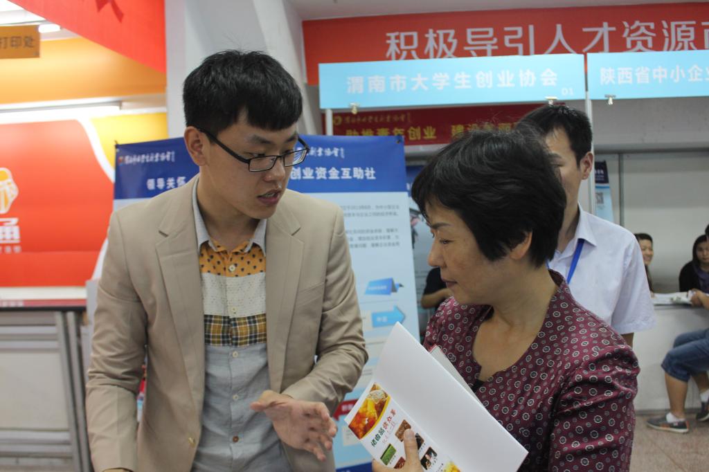 張宇(左)向陜西省人才中心副主任邊放歌(右)介紹團(tuán)隊(duì)創(chuàng)業(yè)項(xiàng)目