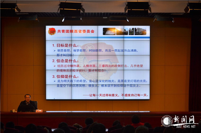 當(dāng)晚19時(shí)30分,共青團(tuán)陜西省委副書記、陜西省青年聯(lián)合會(huì)主席徐永勝作為本屆培訓(xùn)班的首位主講人,在圖書館教師發(fā)展中心,為到場(chǎng)的近600名共青團(tuán)干部、學(xué)生骨干作了《堅(jiān)定理想信念,練就過(guò)硬本領(lǐng),做一個(gè)堅(jiān)定的青年馬克思主義者》的主題報(bào)告。