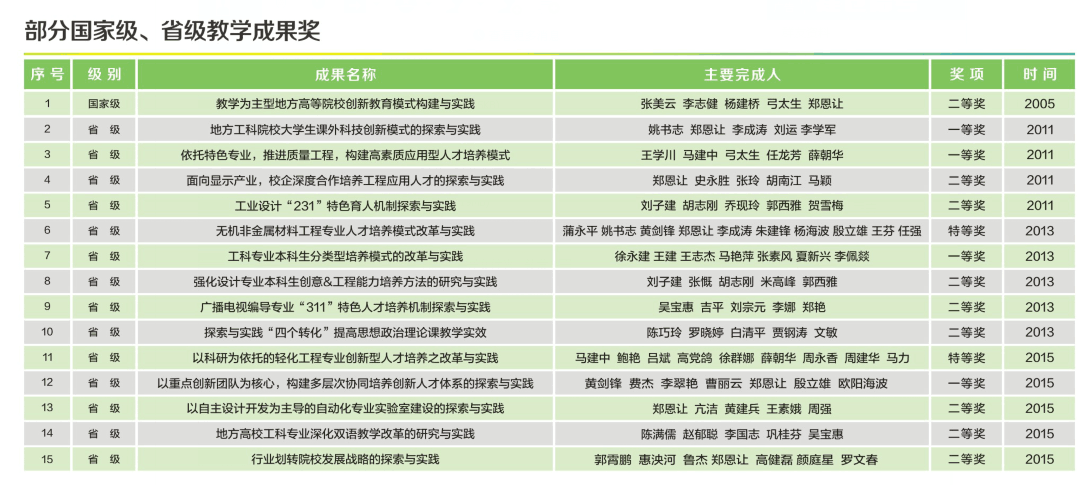 學(xué)校新增本科專(zhuān)業(yè)7個(gè);省部級(jí)教學(xué)成果獎(jiǎng)48項(xiàng);現(xiàn)有國(guó)家級(jí)特色專(zhuān)業(yè)建設(shè)點(diǎn)9個(gè)、省級(jí)特色專(zhuān)業(yè)建設(shè)點(diǎn)13個(gè),陜西省名牌專(zhuān)業(yè)7個(gè),省級(jí)教學(xué)名師有16人;國(guó)家級(jí)本科專(zhuān)業(yè)綜合改革試點(diǎn)項(xiàng)目1項(xiàng)、省級(jí)本科專(zhuān)業(yè)綜合改革試點(diǎn)項(xiàng)目9項(xiàng);國(guó)家級(jí)教學(xué)團(tuán)隊(duì)1個(gè)、省級(jí)教學(xué)團(tuán)隊(duì)24個(gè);國(guó)家級(jí)精品課程4門(mén)、省級(jí)精品課程24門(mén);國(guó)家級(jí)視頻公開(kāi)課程1門(mén),國(guó)家級(jí)精品資源共享課程1門(mén)、省級(jí)精品資源共享課程50門(mén);國(guó)家級(jí)雙語(yǔ)教學(xué)示范課程1門(mén)、省級(jí)雙語(yǔ)教學(xué)示范課程2門(mén);國(guó)家級(jí)實(shí)驗(yàn)教學(xué)示范中心1個(gè)、省級(jí)實(shí)驗(yàn)教學(xué)示范中心10個(gè);國(guó)家級(jí)大學(xué)生校外實(shí)踐教育基地1個(gè)、省級(jí)大學(xué)生校外實(shí)踐教育基地4個(gè);省級(jí)人才培養(yǎng)模式創(chuàng)新實(shí)驗(yàn)區(qū)14個(gè);承擔(dān)省部級(jí)教改項(xiàng)目46項(xiàng)。學(xué)生在各類(lèi)學(xué)科競(jìng)賽和科技創(chuàng)新競(jìng)賽中榮獲國(guó)家級(jí)獎(jiǎng)44項(xiàng)、省級(jí)獎(jiǎng)473項(xiàng)。國(guó)家級(jí)大學(xué)生創(chuàng)新創(chuàng)業(yè)項(xiàng)目151項(xiàng),省級(jí)大學(xué)生創(chuàng)新創(chuàng)業(yè)項(xiàng)目239項(xiàng)。