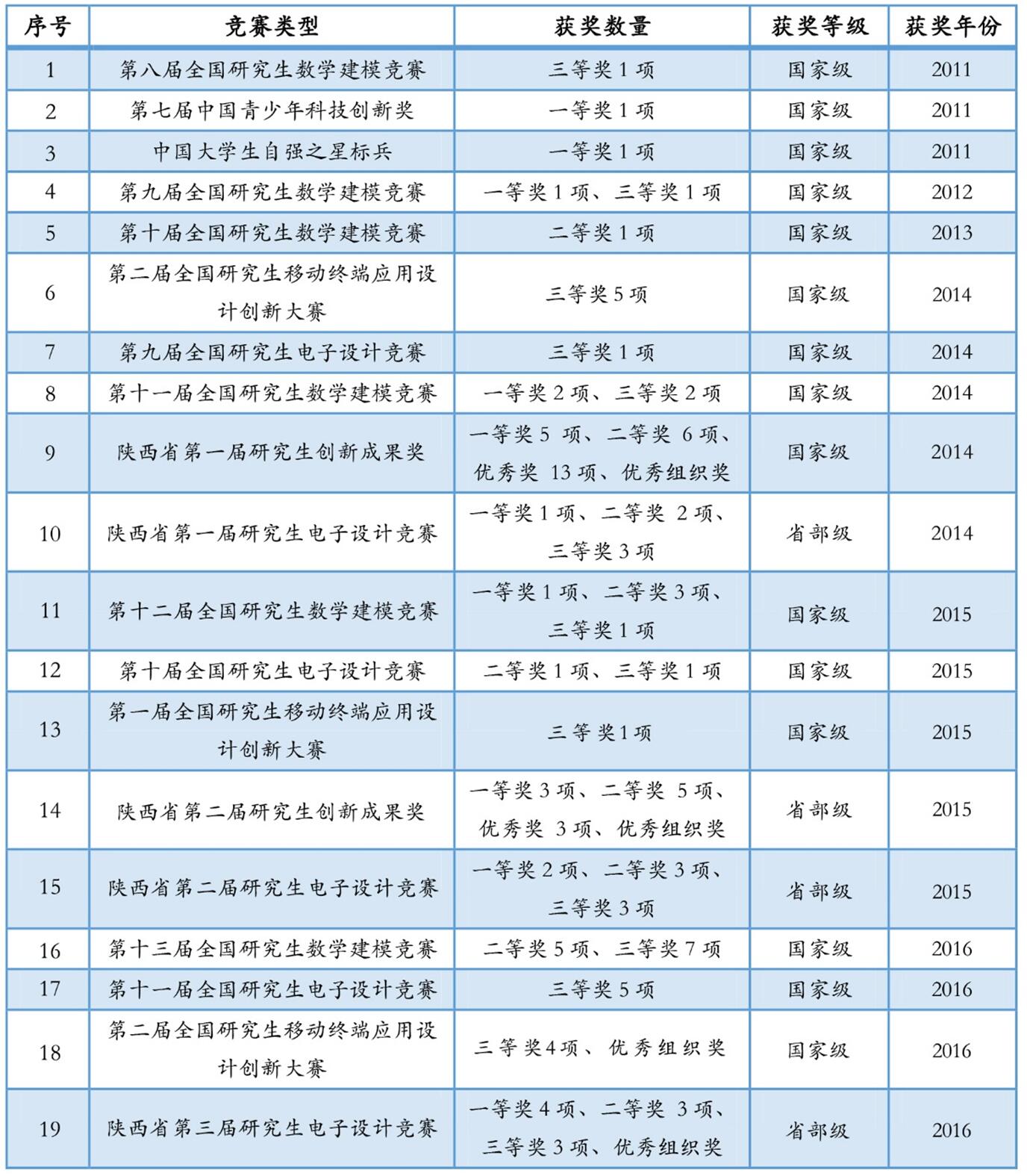聚焦各類創(chuàng)新賽事,積極組織研究生參加教育部“研究生創(chuàng)新實(shí)踐系列活動(dòng)”、陜西省研究生創(chuàng)新成果展等國家和地方學(xué)科競賽,近年來累計(jì)投入經(jīng)費(fèi)240萬元,參加人數(shù)達(dá)到2100余人,先后斬獲國家級(jí)獎(jiǎng)項(xiàng)45項(xiàng),省部級(jí)獎(jiǎng)項(xiàng)59項(xiàng);其中在第一、二屆陜西省研究生創(chuàng)新成果展中獲一等獎(jiǎng)8項(xiàng),二等獎(jiǎng)11項(xiàng),優(yōu)秀獎(jiǎng)16項(xiàng),位列陜西省屬高校第一。