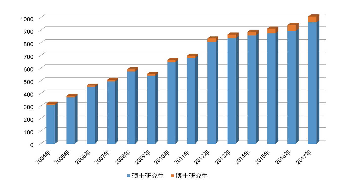 研究生招生規(guī)模不斷擴(kuò)大,自2004年開始博士研究生招生以來,研究生招生數(shù)量增長超過三倍,2017年碩士研究生招生達(dá)到932人,博士研究生招生52人,目前各類在校全日制研究生2821名;同時(shí),形成了“本碩博”一體化的創(chuàng)新型人才選拔機(jī)制,通過實(shí)施碩士研究生“優(yōu)秀生源計(jì)劃”、推免生“4+2”學(xué)制,博士研究生“碩博連讀”和“申請(qǐng)-考核”制,2017年推免生和碩士研究生本校生源率分別達(dá)到97.45%和53.04%,全日制非定向博士研究生比例連年增長,生源質(zhì)量顯著提高。