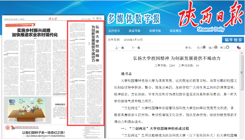 《陜西日?qǐng)?bào)》1月10日理論版刊發(fā)了我校黨委書(shū)記姚書(shū)志的署名文章《弘揚(yáng)大學(xué)校園精神 為創(chuàng)新發(fā)展提供不竭動(dòng)力》。