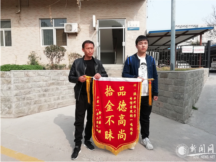 來(lái)自陜西榆林的徐衛(wèi)國(guó)先生3月12日一大早就趕到陜西科技大學(xué),分別將寫(xiě)有“拾金不昧,忠誠(chéng)衛(wèi)士”和“拾金不昧,品德高尚”的兩面錦旗,鄭重地送到學(xué)校保衛(wèi)處、電氣與信息工程學(xué)院大四學(xué)生張一鳴手中,以此表達(dá)他深深的謝意。3月5日晚上10點(diǎn)左右,張一鳴同學(xué)在杜家堡十字路口撿到一個(gè)紅色塑料袋,發(fā)現(xiàn)內(nèi)有錢(qián)包一個(gè)、現(xiàn)金一萬(wàn)余元、銀行卡若干和身份證。他將物品交至校保衛(wèi)處。經(jīng)學(xué)校保衛(wèi)處努力,于3月8日成功聯(lián)系上失主徐衛(wèi)國(guó)。
