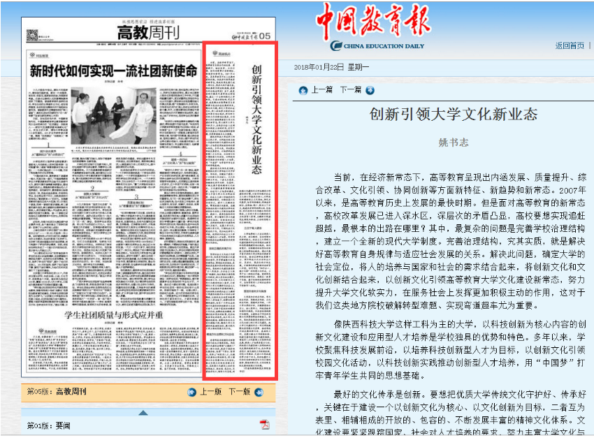 《中國(guó)教育報(bào)》2018年1月22日《高教周刊》版“高端視點(diǎn)”欄目刊發(fā)我校黨委書(shū)記姚書(shū)志署名文章《創(chuàng)新引領(lǐng)大學(xué)文化新業(yè)態(tài)》。