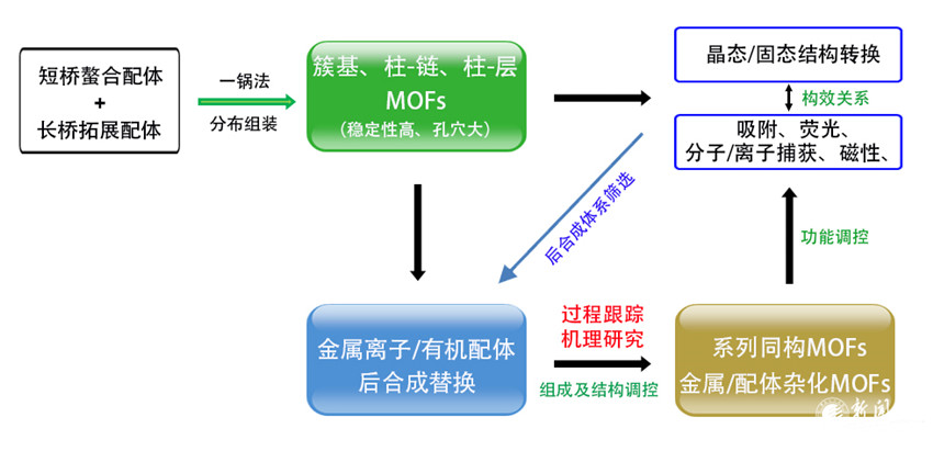 項(xiàng)目的研究重點(diǎn)是利用特定結(jié)構(gòu)MOFs為母體,探尋后合成金屬離子或有機(jī)配體替換的新實(shí)例和新路線。研究金屬離子、配體,溶劑、濃度、溫度,抗衡離子等反應(yīng)條件等對(duì)后合成替換速率,反應(yīng)位點(diǎn),替換完整性、可逆性的影響;以及多金屬或多配體共存體系中后合成替換的競(jìng)爭(zhēng)性與選擇性,獲得對(duì)反應(yīng)機(jī)理的理性認(rèn)識(shí)。通過后合成替換反應(yīng)條件控制,獲得金屬離子、有機(jī)配體不同的系列同構(gòu)MOFs,以及可能的多金屬/配體共存型雜化MOFs。研究后合成替換對(duì)框架整體/局部、孔穴結(jié)構(gòu),及吸附、分子/離子捕獲、熒光、磁性、催化等可能性質(zhì)的調(diào)控。