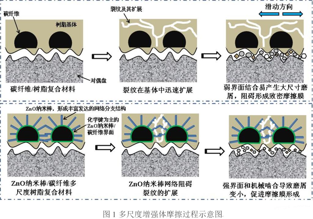 濕式摩擦材料主要應(yīng)用于汽車中的自動變速器、差速器、扭矩管理器和同步器等濕式傳動/制動系統(tǒng)中,其厚度僅為0.40-0.80mm,但摩擦表層需要承受高速剪切、摩擦熱沖擊以及高溫潤滑油浸蝕等苛刻條件。通俗來講,碳纖維增強(qiáng)的復(fù)合材料類似于鋼筋混凝土結(jié)構(gòu)。我們都知道在鋼筋表面垂直焊接固定較短的鋼筋,則在澆筑混凝土后能進(jìn)一步提高整體性能?;诖?,我們在不破壞碳纖維結(jié)構(gòu)和性能的前提下,在碳纖維表面接枝易于與樹脂基體反應(yīng)的官能團(tuán),采用液相法在碳纖維表面垂直生長納米棒,形成典型的“狼牙棒”結(jié)構(gòu),使增強(qiáng)體“犬牙交錯”狀分布在基體中,則可大幅度改善其與基體的結(jié)合,使復(fù)合材料在摩擦過程中更加穩(wěn)定,提高摩擦磨損性能,進(jìn)而延長摩擦副的使用壽命,多尺度增強(qiáng)體在摩擦磨損過程中的作用如圖1所示。通過該研究,可以為摩擦材料的多尺度設(shè)計提供指導(dǎo),進(jìn)而為汽車濕式傳動/制動系統(tǒng)摩擦副產(chǎn)品的更新?lián)Q代提供理論支撐和技術(shù)服務(wù)。