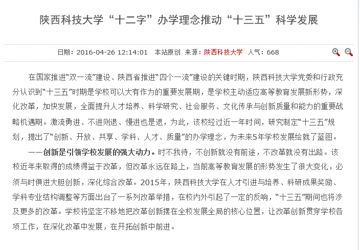 4月26日,陜西省教育廳門(mén)戶(hù)網(wǎng)站在主頁(yè)“熱點(diǎn)聚焦”的位置,以《陜西科技大學(xué)“十二字”辦學(xué)理念推動(dòng)“十三五”科學(xué)發(fā)展》為題,報(bào)道我校主動(dòng)適應(yīng)高等教育發(fā)展新形勢(shì),深化改革,加快發(fā)展,全面提升人才培養(yǎng)、科學(xué)研究、社會(huì)服務(wù)、文化傳承與創(chuàng)新質(zhì)量和能力的重要戰(zhàn)略機(jī)遇期。學(xué)校經(jīng)過(guò)近一年時(shí)間,研究制定“十三五”規(guī)劃,提出了“創(chuàng)新、開(kāi)放、共享、學(xué)科、人才、質(zhì)量”的辦學(xué)理念,為未來(lái)5年學(xué)校發(fā)展繪就了藍(lán)圖。