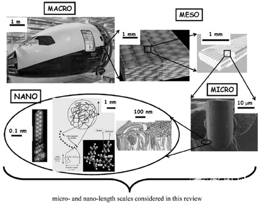 圖2 波音787用樹(shù)脂基復(fù)合材料結(jié)構(gòu)件的多尺度設(shè)計(jì)(納觀-微觀-介觀-宏觀) [圖片引自Journal of Materials Science, 2008, 43(20): 6747-6757]