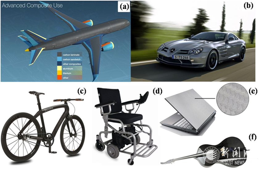 圖1 碳纖維復(fù)合材料的應(yīng)用:(a) 波音787, (b) 奔馳全碳纖維復(fù)合材料汽車(chē), (c) 自行車(chē), (d) 輪椅, (e)筆記本電腦, (f) 小提琴