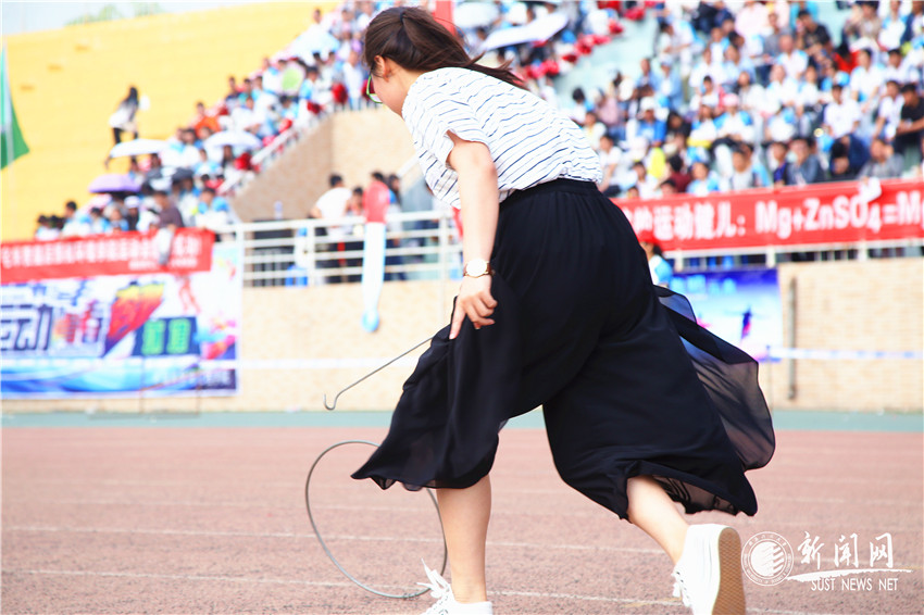 大學(xué)生組男女混合滾鐵環(huán)項(xiàng)目于上午8:35舉行,共10隊(duì)分兩組舉行,選手來回接力滾鐵環(huán),鐵環(huán)掉落或者亂道都會導(dǎo)致名次落后。選手們來回穿梭,鐵環(huán)快速旋轉(zhuǎn)沖向終點(diǎn)。一名比賽完的女同學(xué)說:“盡管我鐵環(huán)掉落,但是我還是必須重新出發(fā),奔向終點(diǎn)。”這種趣味性的項(xiàng)目同樣體現(xiàn)著堅(jiān)持不懈的體育精神。最終,機(jī)電學(xué)院榮獲第一名。