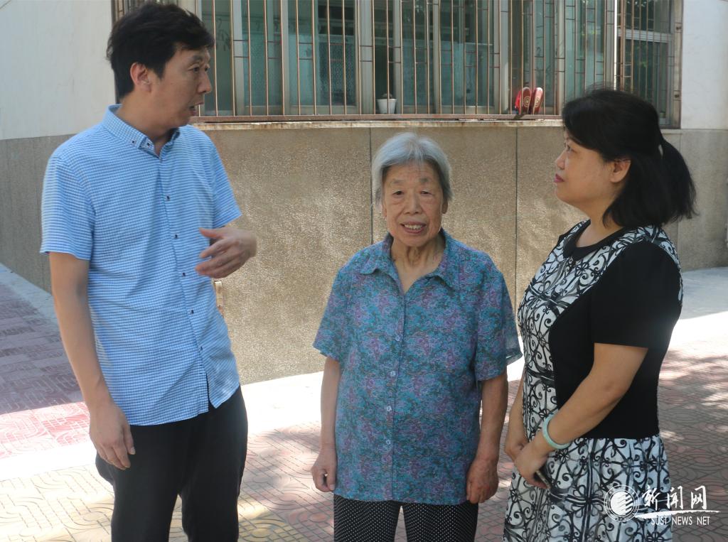 圖為吳穎杰(左)與退休職工高秀珍(中)交談