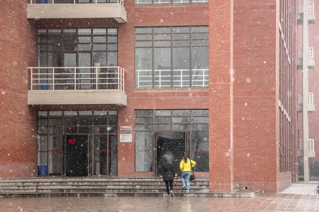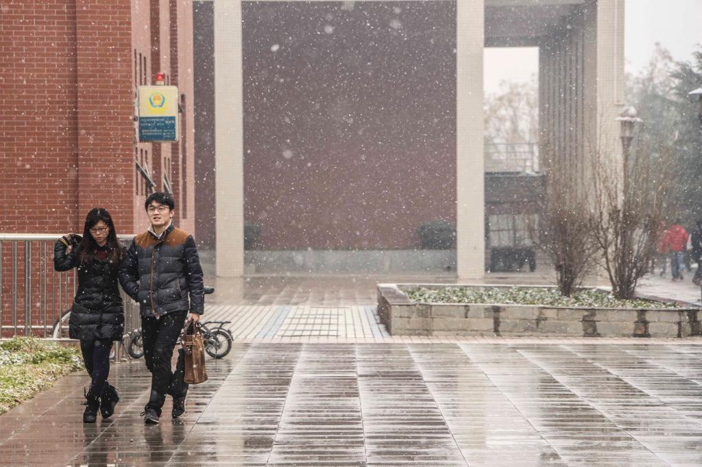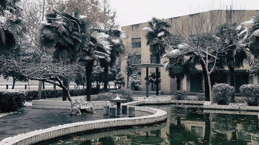 2016年1月12日,新年的第一場雪普降西安。她迎著萬眾期盼的目光,帶著2015年喜悅的記憶,飛向大地,飛入科大校園。清晨的半明半暗之際,她在咸陽校區(qū)的?;丈蠟⑾乱黄匮诺陌?;她輕盈地拂過老圖書館外的馬賽克壁畫;她在老體育館外留下一場驚心動魄的靜美;當這個“冬之精靈”來到西安校區(qū)時,圖書館和它的倒影雙雙凝成了一首詩;轉眼之間,她又定格在了一尊小小的像上;或是讓人在純純的潔白上留下屬于自己的印記;天愈來愈亮,青松在她的舞動中依然挺拔;她吻著草坪,來年的春天會奉送新綠;銀裝素裹的大地無處不是她描繪的畫意;她擁抱大樓,欲飛的蒼龍顯得如此安然;本是玲瓏剔透的清凈體,何曾染過一絲塵埃;她最終落在新綠上找到自己的歸宿——“冬天來了,春天還會遠嗎?”雪來了,她笑著、飛舞著,向我們親切地打著招呼——一個人的道路,因為她的陪伴不再孤單;兩個人踩著碎銀,走出歡快的清歌;一群人在這洋洋灑灑的世界里沖破霧的迷茫,踏出無悔的青春節(jié)拍……
