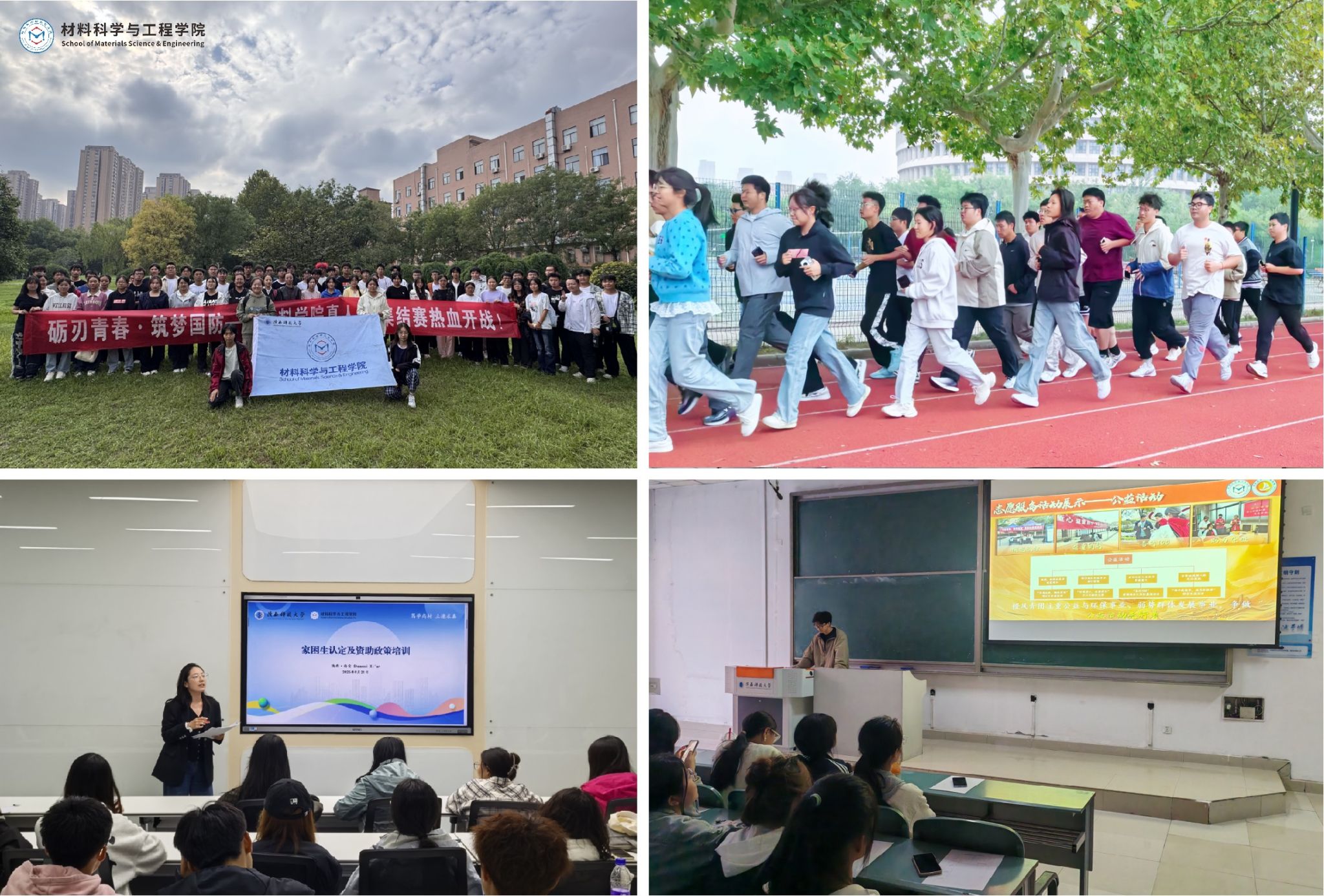 促進五育并舉,拓展多元成長平臺,賦能學(xué)生發(fā)展。學(xué)院高度重視學(xué)生多元發(fā)展,打造“體·閱·學(xué)”三維浸潤計劃,以“晨練暮學(xué)行動”為抓手,提升新生對于閱讀和體育的熱情,營造優(yōu)良學(xué)風(fēng)氛圍;軍訓(xùn)期間開展“礪刃青春?材子筑夢”校園真人CS大賽,在實踐中體悟國防意義,為破解校園多元互動難題提供了趣味載體;開展競賽科普、職業(yè)生涯規(guī)劃、資助政策宣講等專題講座,加強新生對科創(chuàng)競賽的認識,解答新生個人規(guī)劃、考研與就業(yè)形勢、資助政策等方面問題;舉辦新生辯論賽、校歌傳唱選拔賽、學(xué)生組織宣講會等,提高新生對參與課外活動的熱情,鍛煉同學(xué)們的邏輯思維與書面表達能力,增強同學(xué)們身體素質(zhì)與班級凝聚力,極大程度上豐富了同學(xué)們的課余生活。