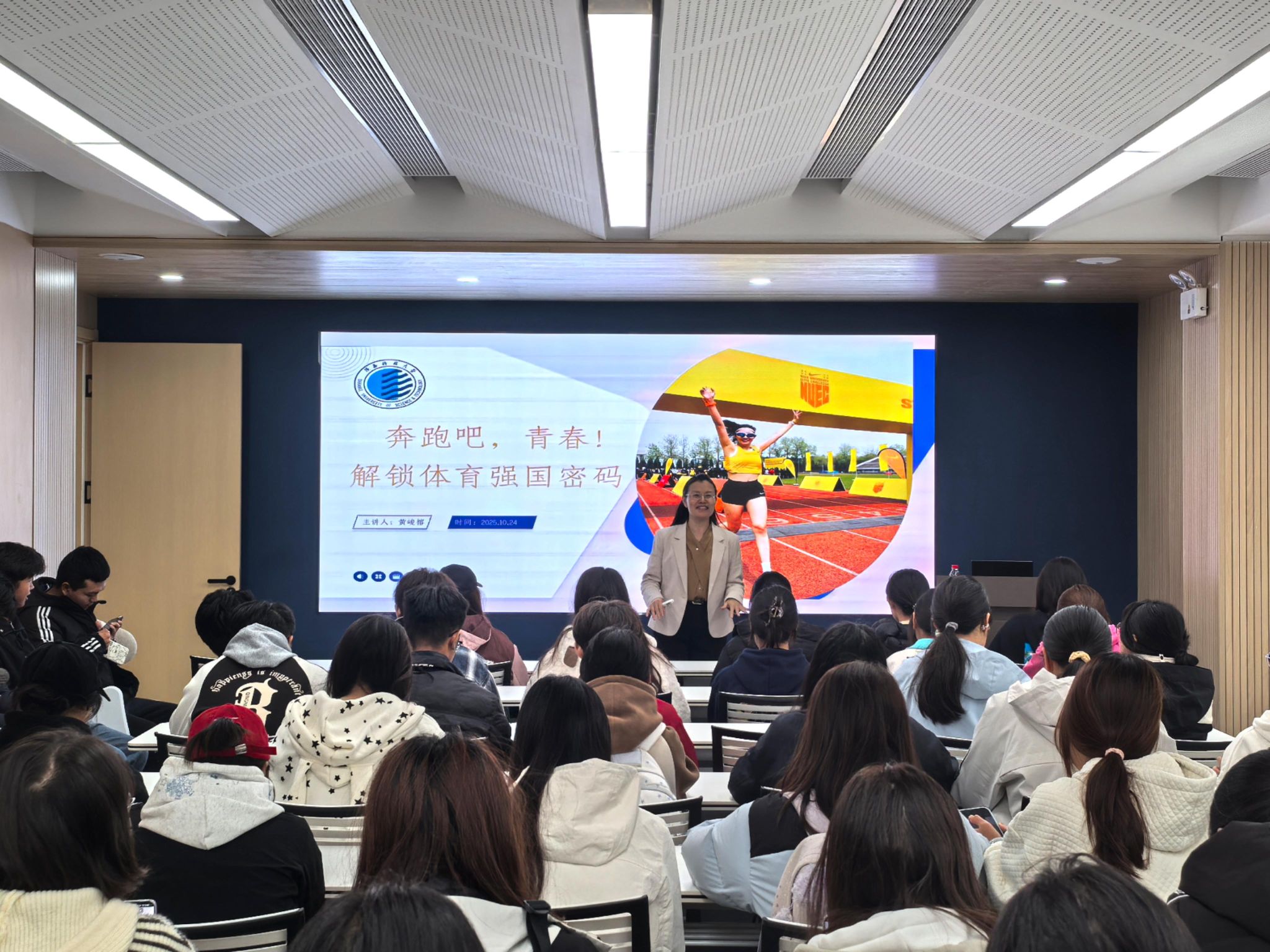 10月24日,學(xué)科建設(shè)辦公室主任黃峻榕以“奔跑吧,青春!——解鎖體育強國密碼”為題,為食品學(xué)院大一新生講授“加快建設(shè)體育強國”專題思政課。