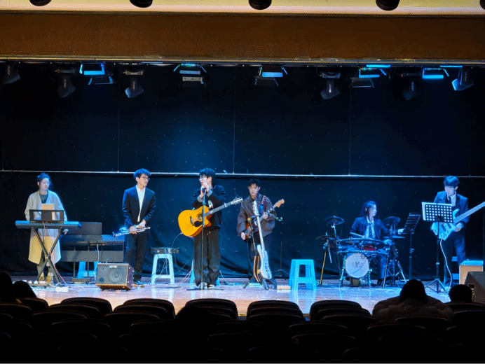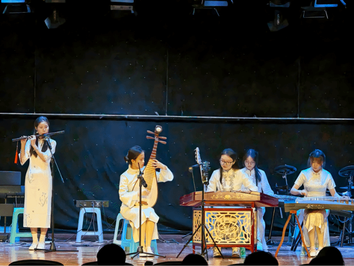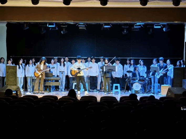 演出現(xiàn)場,古箏的悠揚(yáng)、竹笛的清脆與電聲樂器的激昂交織碰撞。民樂協(xié)奏曲《寄明月》以悠揚(yáng)旋律,引發(fā)在場觀眾共鳴;管樂協(xié)奏曲《鋼鐵洪流進(jìn)行曲》氣勢恢宏,喚起同學(xué)們內(nèi)心力量。2024年被“中國青年報(bào)”轉(zhuǎn)載的曲目《云宮迅音》再次演繹,傳統(tǒng)民樂與現(xiàn)代電聲器樂的融合,讓現(xiàn)場觀眾沉浸式感受民族音樂與現(xiàn)代音樂碰撞的獨(dú)特魅力;演出尾聲,全體同學(xué)共同演奏《送別》,熟悉的旋律引發(fā)全場大合唱,將活動(dòng)推向高潮。