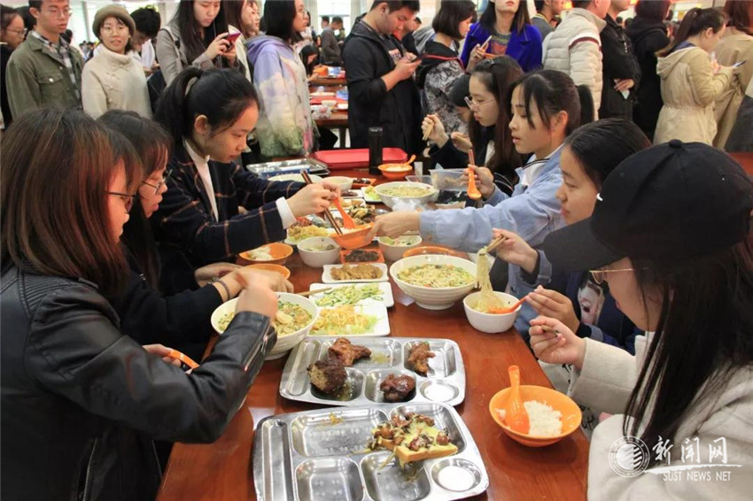 美食節(jié)上我校張征、梁小龍兩位廚師烹制的臊子面一經(jīng)推出,大受歡迎,師生們?cè)谖倚=涣鞔翱谂牌鹆怂陌俣嗝组L(zhǎng)的隊(duì)伍,迫不及待地品嘗湯鮮味美的關(guān)中臊子面,一碗碗“薄、筋、光,煎、稀、汪,酸、辣、香”的臊子面讓江南大學(xué)師生豎起大拇指,許多同學(xué)在品嘗后表示:“臊子面酸辣鮮香,筋道彈牙,頗具西北風(fēng)味,為師生的餐桌增添了一道亮麗的風(fēng)景線,像這樣的伙食交流很棒!”兩位師傅還在現(xiàn)場(chǎng)為師生展示扯面技能,引來師生陣陣歡呼。