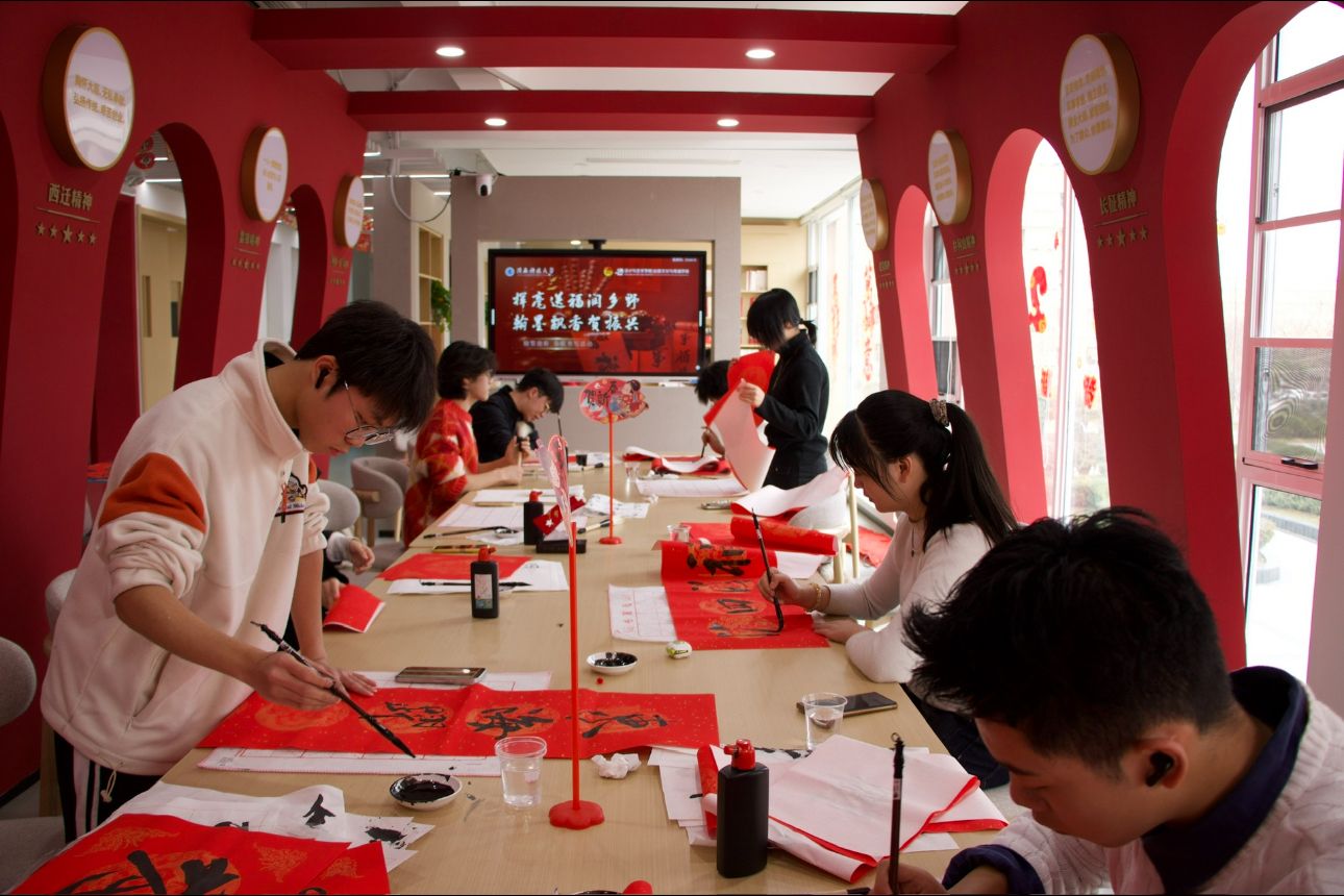 三家單位精心組織教職工書畫家協(xié)會、大學(xué)生書法協(xié)會、咸陽市墨道書法協(xié)會共30余名師生,現(xiàn)場凝神揮毫,筆走龍蛇。一幅幅承載美好愿景的春聯(lián)、一個個蒼勁有力的“?!弊周S然紙上,既飽含對新年的真誠祝福,更浸潤著中華優(yōu)秀傳統(tǒng)文化的深厚底蘊?;顒永塾嫊鴮懘郝?lián)和福字400余幅。此次活動緊密結(jié)合學(xué)校特色優(yōu)勢,精準(zhǔn)契合服務(wù)地方發(fā)展和引領(lǐng)學(xué)生成長成才,不僅是踐行推進城鄉(xiāng)文化融合發(fā)展的生動實踐,更是一堂以文化人、以文惠民、以文興業(yè)的鮮活課堂。