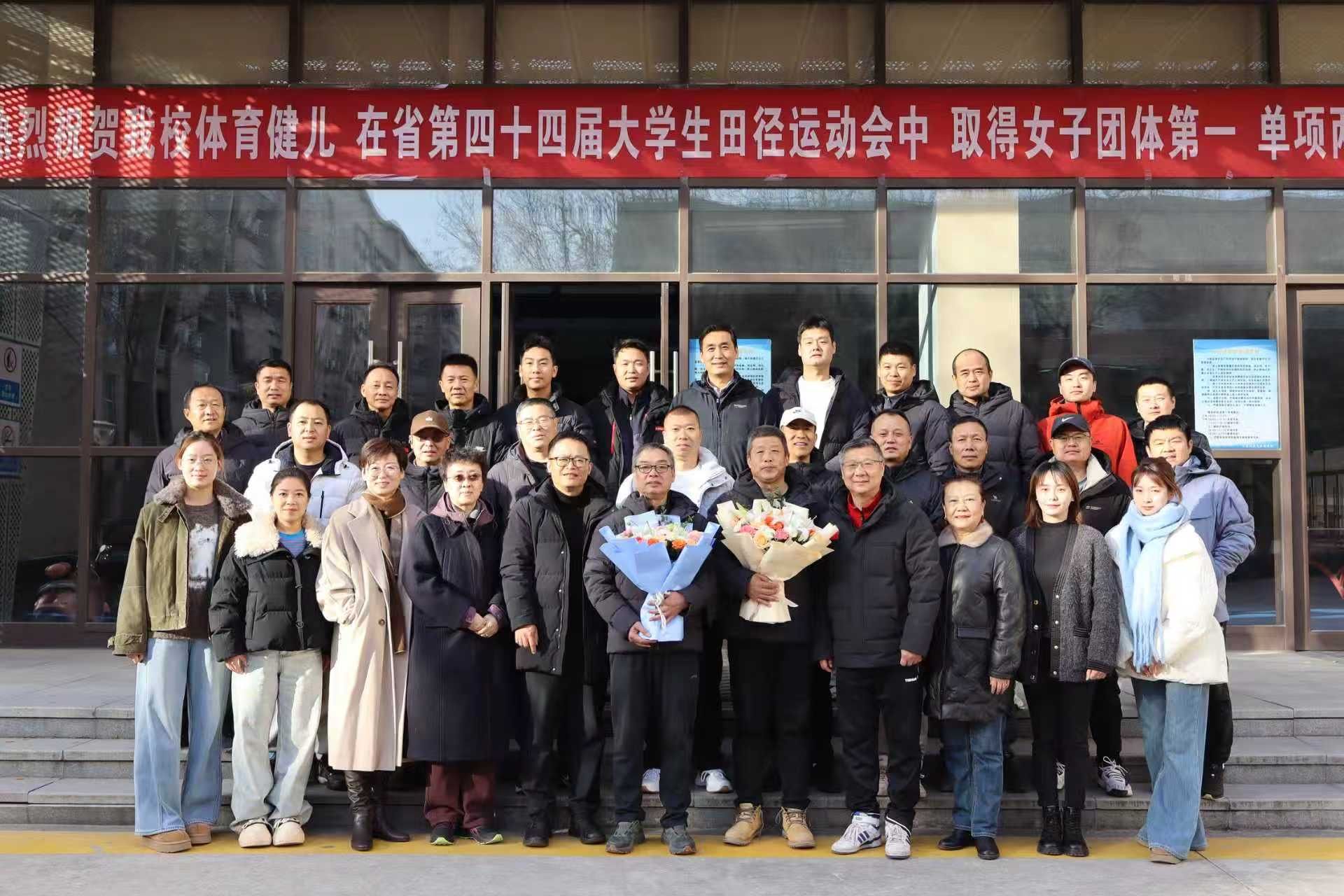 儀式上,體育部兩位負責人為詹永順、朱炳和老師頒發(fā)退休紀念品。青年教師代表將飽含敬意與祝福的鮮花送到兩位教師手中。這一束束鮮花,既是后輩對前輩數(shù)十年堅守與奉獻的由衷致敬,也象征著體育部教育初心的傳承、事業(yè)發(fā)展的薪火相繼,讓整場儀式更添溫情與使命感。儀式尾聲,全體教職工前往北區(qū)體育館門口合影留念,用鏡頭定格下這一溫馨難忘的時刻,為此次榮休儀式畫上圓滿句號。